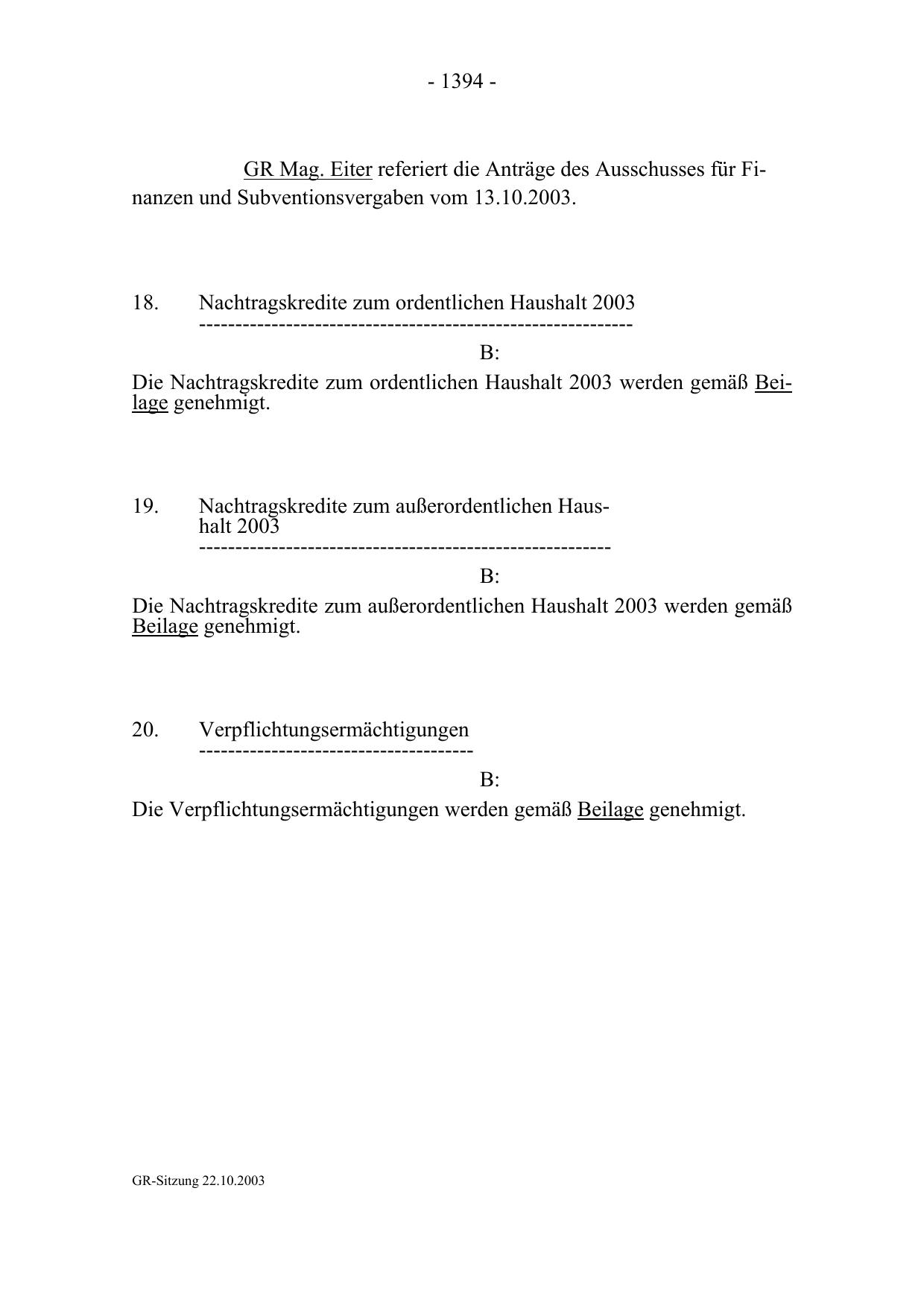 GR Mag. Eiter referiert die Anträge des Ausschusses für Finanzen und Subventionsvergaben vom 13.10.2003.