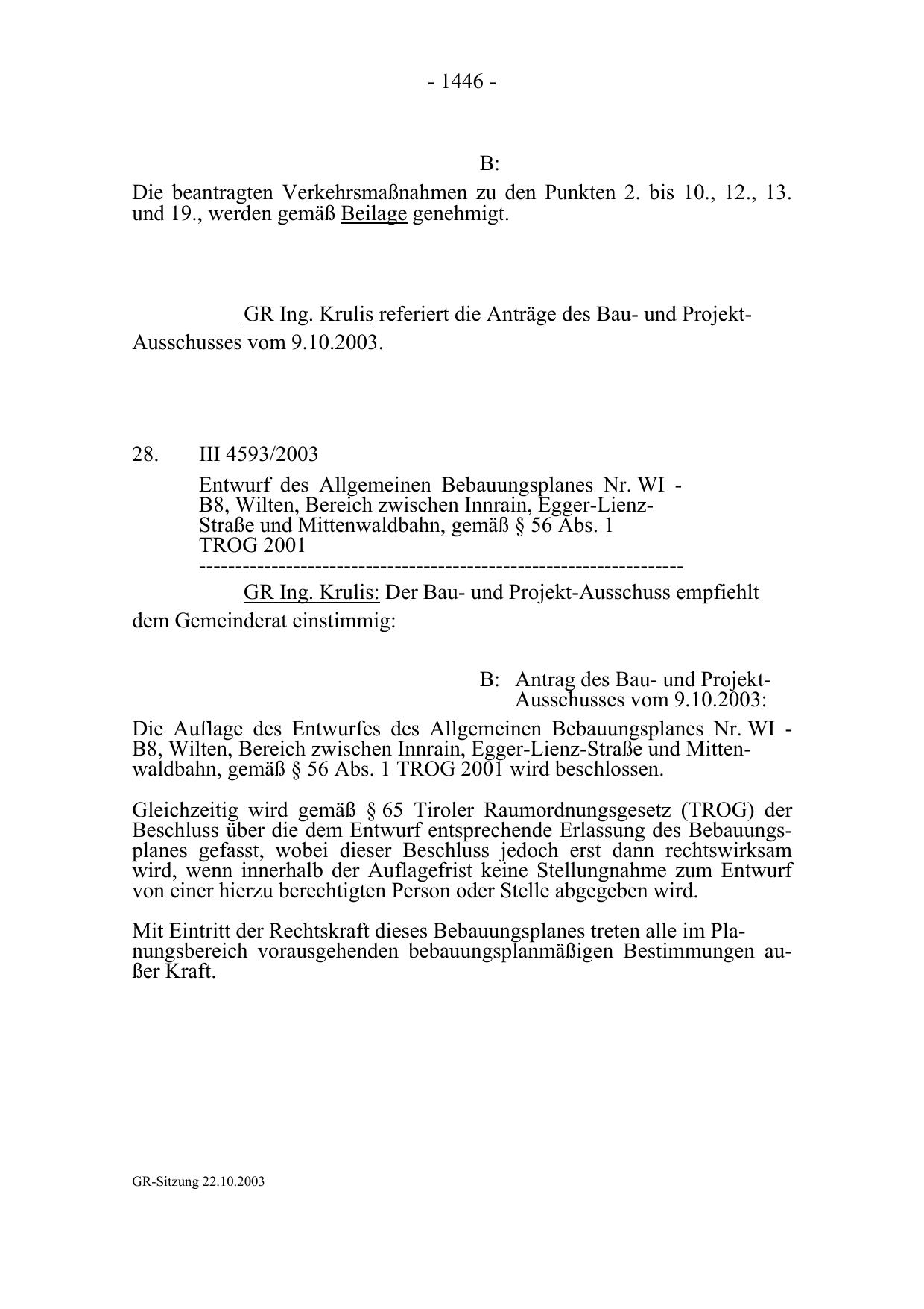 Die Auflage des Entwurfes des Allgemeinen Bebauungsplanes Nr. WI B8, Wilten, Bereich zwischen Innrain, Egger-Lienz-Straße und Mittenwaldbahn, gemäß § 56 Abs. 1 TROG 2001 wird beschlossen.