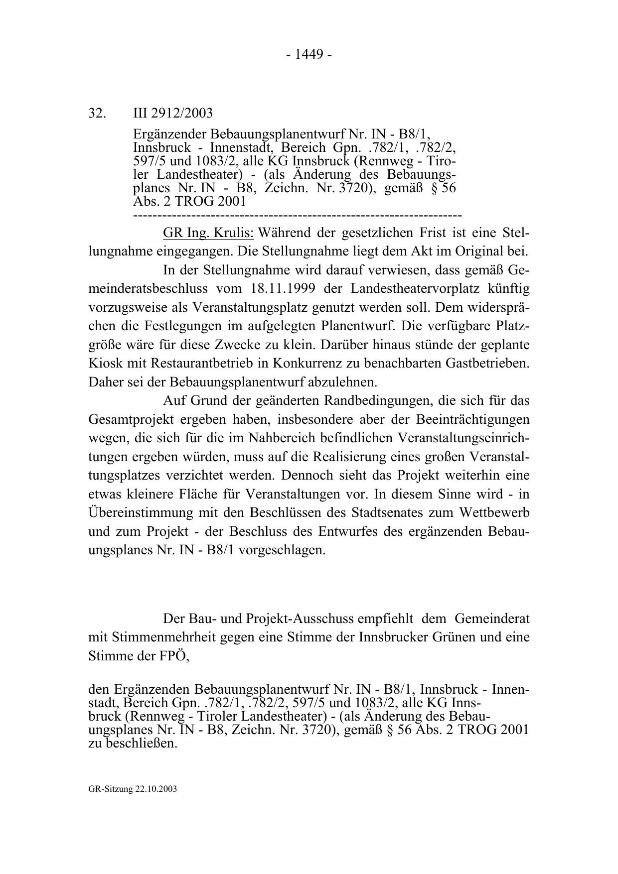 597/5 und 1083/2, alle KG Innsbruck (Rennweg - Tiroler Landestheater) - (als Änderung des Bebauungsplanes Nr. IN - B8, Zeichn. Nr. 3720), gemäß § 56
