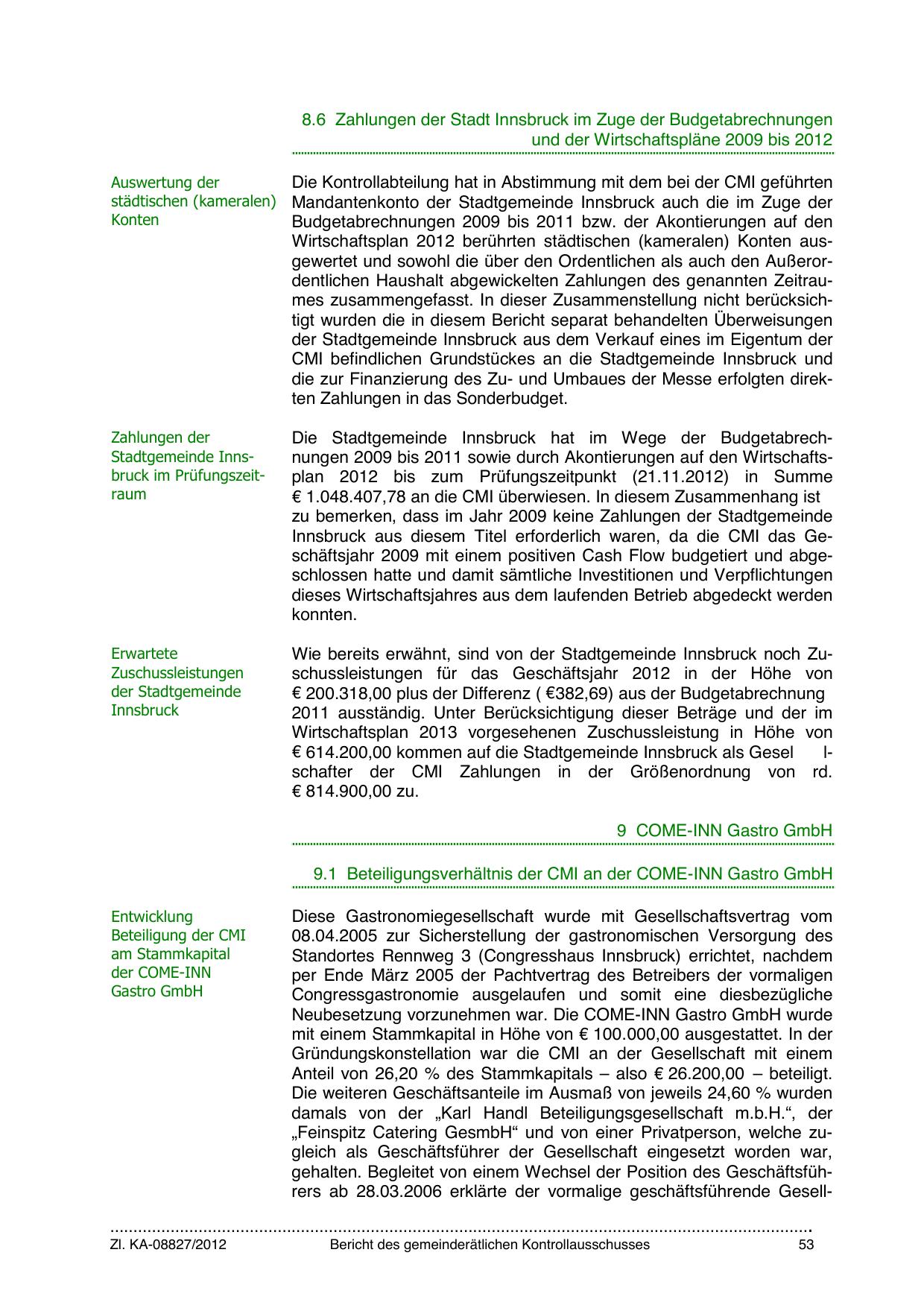 Die Stadtgemeinde Innsbruck hat im Wege der Budgetabrechnungen 2009 bis 2011 sowie durch Akontierungen auf den Wirtschaftsplan 2012 bis zum Prüfungszeitpunkt (21.11.2012) in Summe