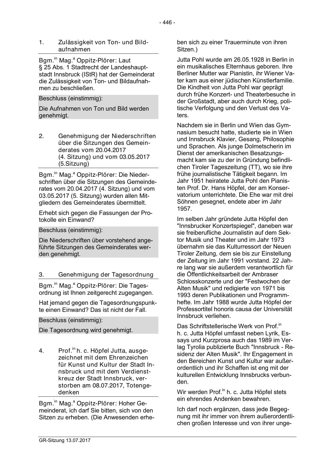 Bgm.in Mag.a Oppitz-Plörer: Die Niederschriften über die Sitzungen des Gemeinderates vom 20.04.2017 (4. Sitzung) und vom