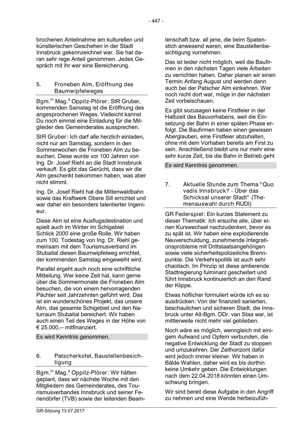 Mitgliedern des Gemeinderates, des Tourismusverbandes Innsbruck und seiner Feriendörfer (TVB) sowie der leitenden BeamGR-Sitzung 13.07.2017