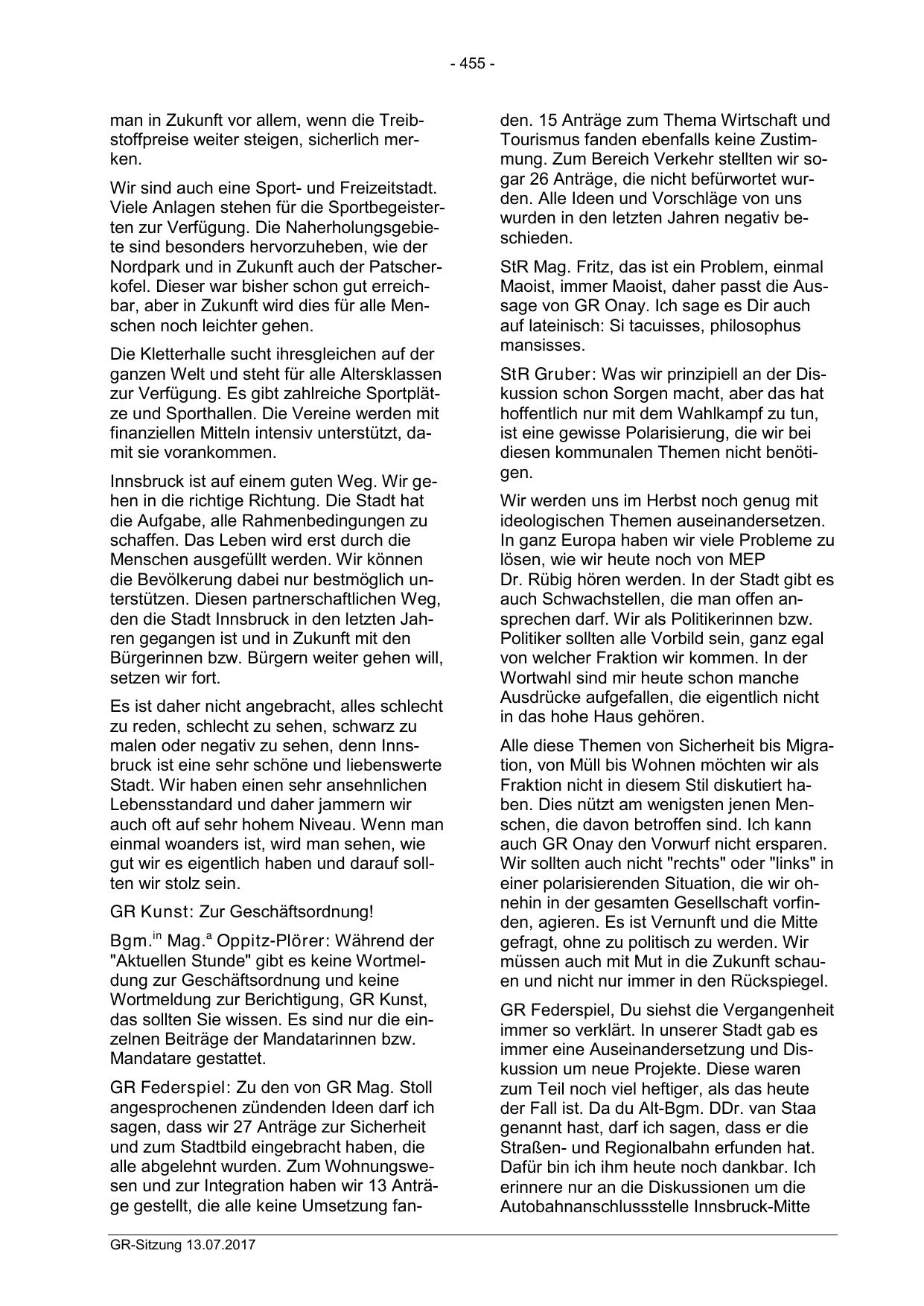 alle abgelehnt wurden. Zum Wohnungswesen und zur Integration haben wir 13 Anträge gestellt, die alle keine Umsetzung fanGR-Sitzung 13.07.2017