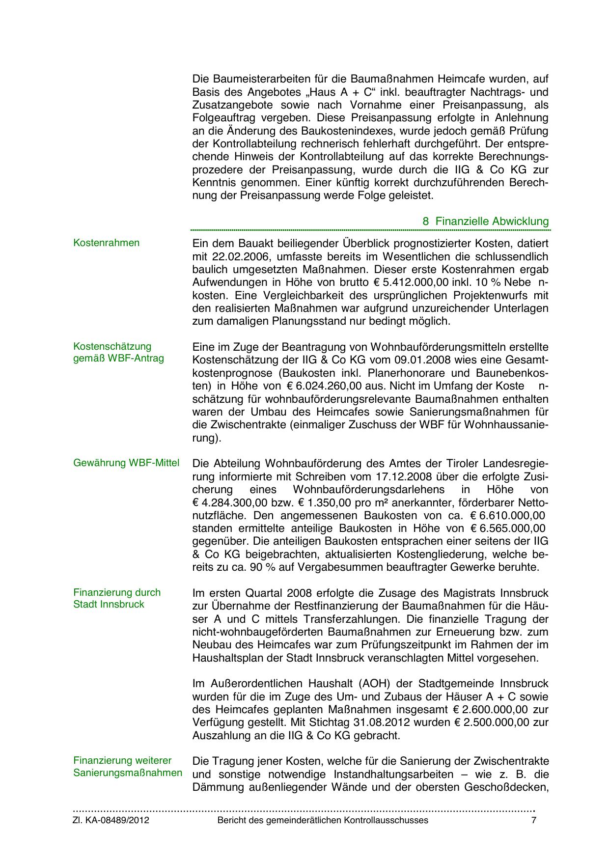 Kostenschätzung der IIG & Co KG vom 09.01.2008 wies eine Gesamtkostenprognose (Baukosten inkl. Planerhonorare und Baunebenkosten) in Höhe von € 6.024.260,00 aus. Nicht im Umfang der Koste nschätzung für wohnbauförderungsrelevante Baumaßnahmen enthalten