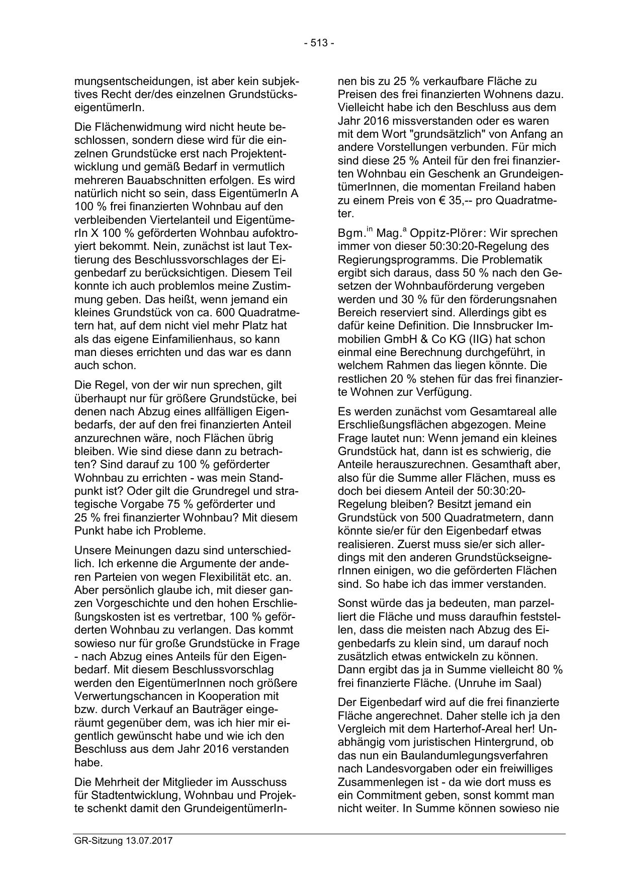 für Stadtentwicklung, Wohnbau und Projekte schenkt damit den GrundeigentümerInGR-Sitzung 13.07.2017