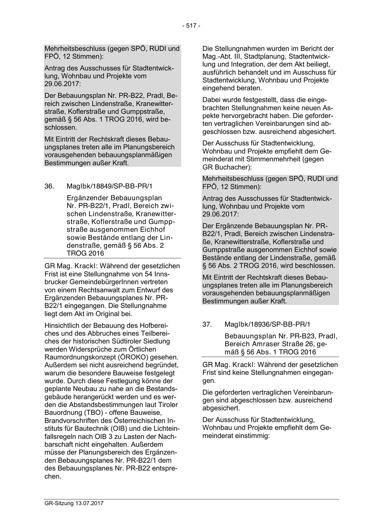 Der Bebauungsplan Nr. PR-B22, Pradl, Bereich zwischen Lindenstraße, Kranewitterstraße, Koflerstraße und Gumppstraße,