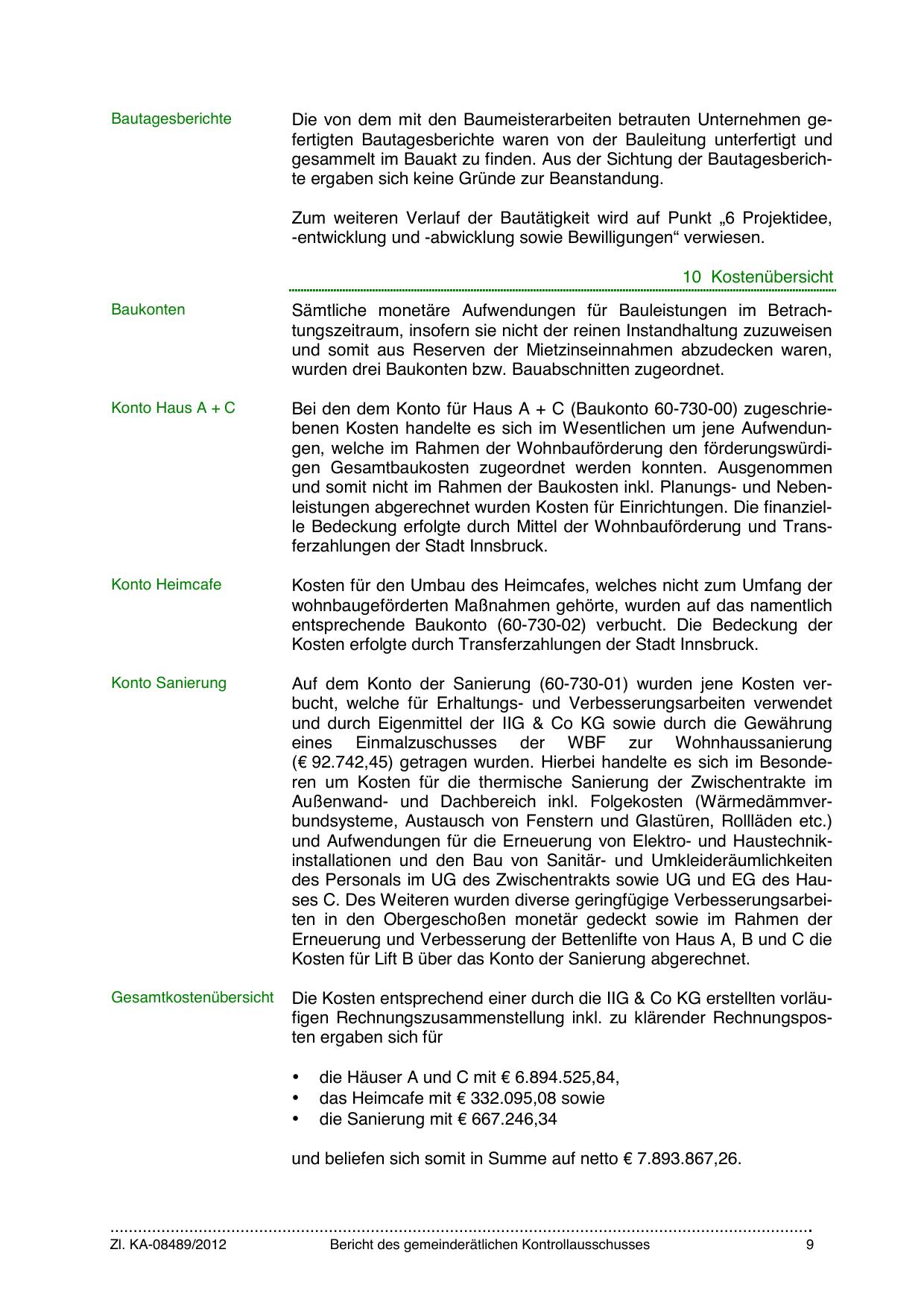 und somit nicht im Rahmen der Baukosten inkl. Planungs- und Nebenleistungen abgerechnet wurden Kosten für Einrichtungen. Die finanzielle Bedeckung erfolgte durch Mittel der Wohnbauförderung und Transferzahlungen der Stadt Innsbruck.