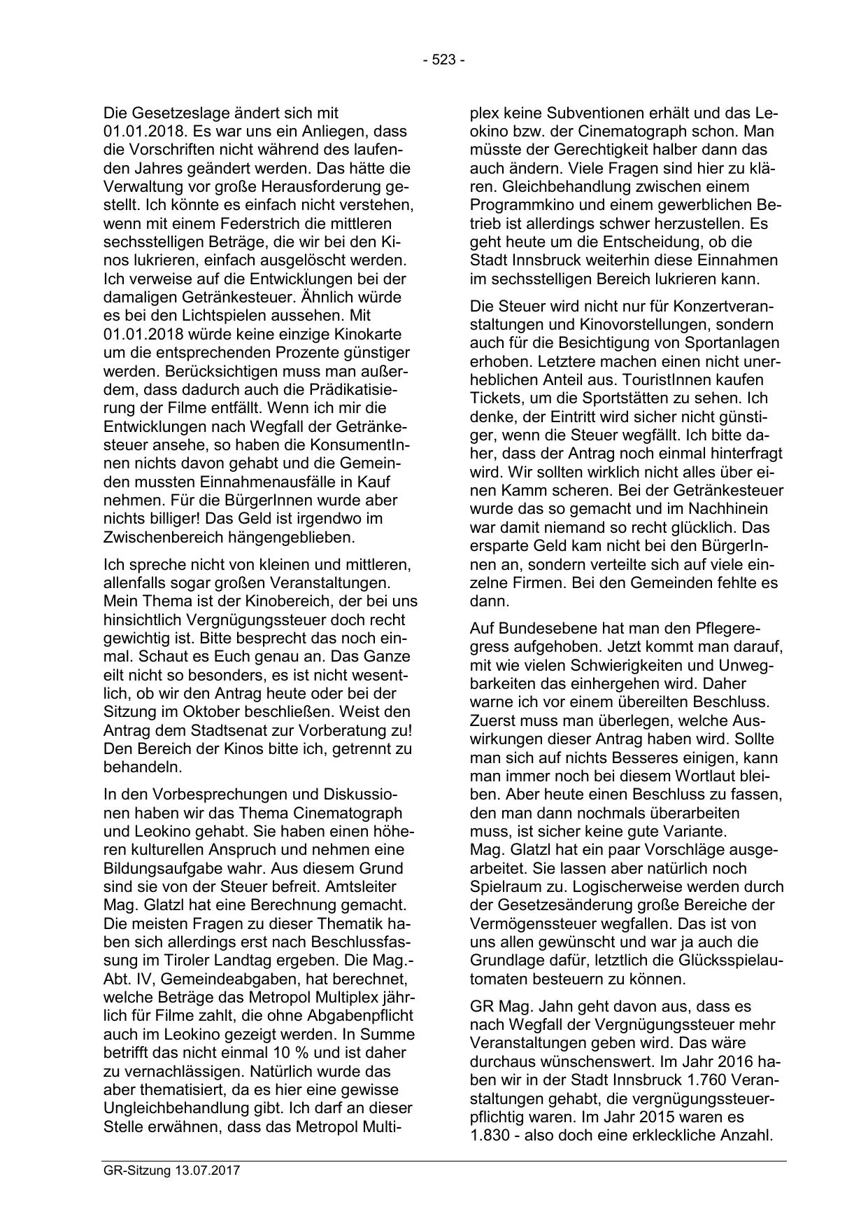 durchaus wünschenswert. Im Jahr 2016 haben wir in der Stadt Innsbruck 1.760 Veranstaltungen gehabt, die vergnügungssteuerpflichtig waren. Im Jahr 2015 waren es
