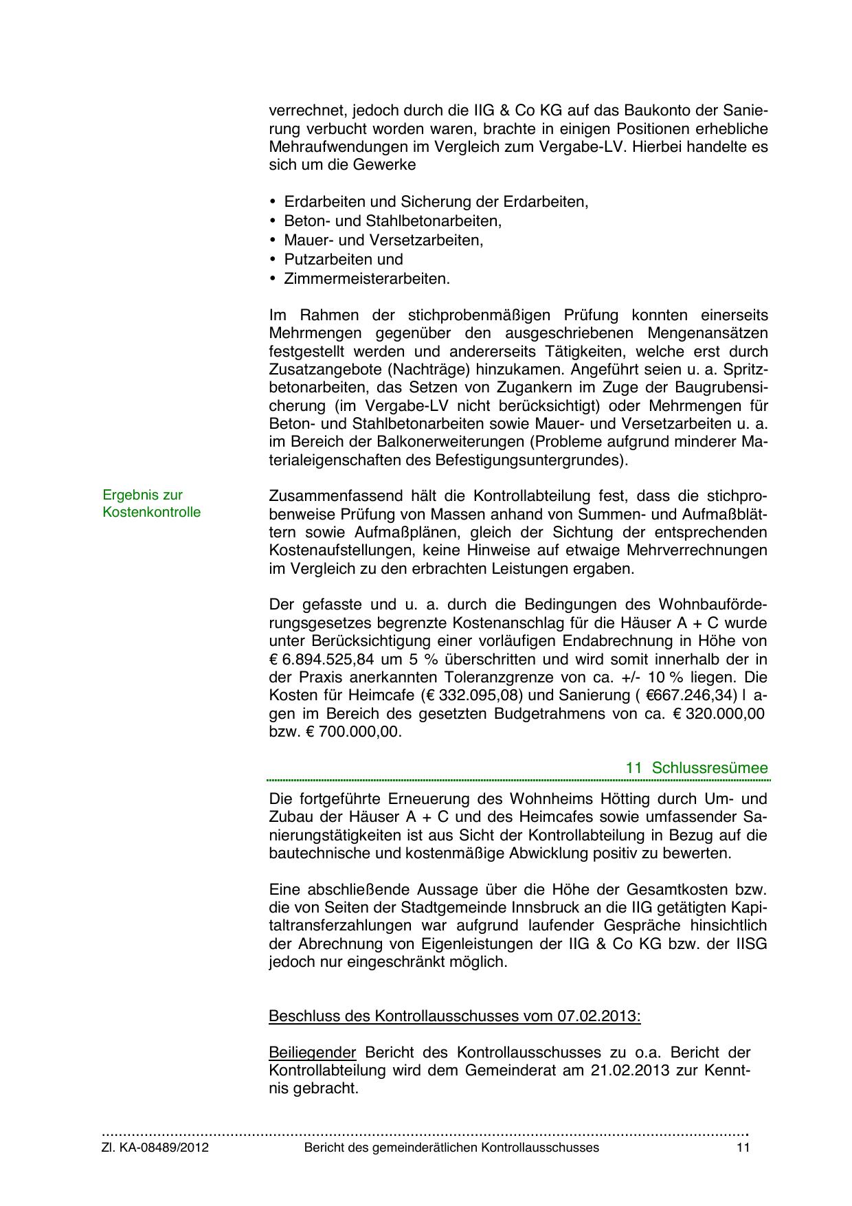 Zubau der Häuser A + C und des Heimcafes sowie umfassender Sanierungstätigkeiten ist aus Sicht der Kontrollabteilung in Bezug auf die