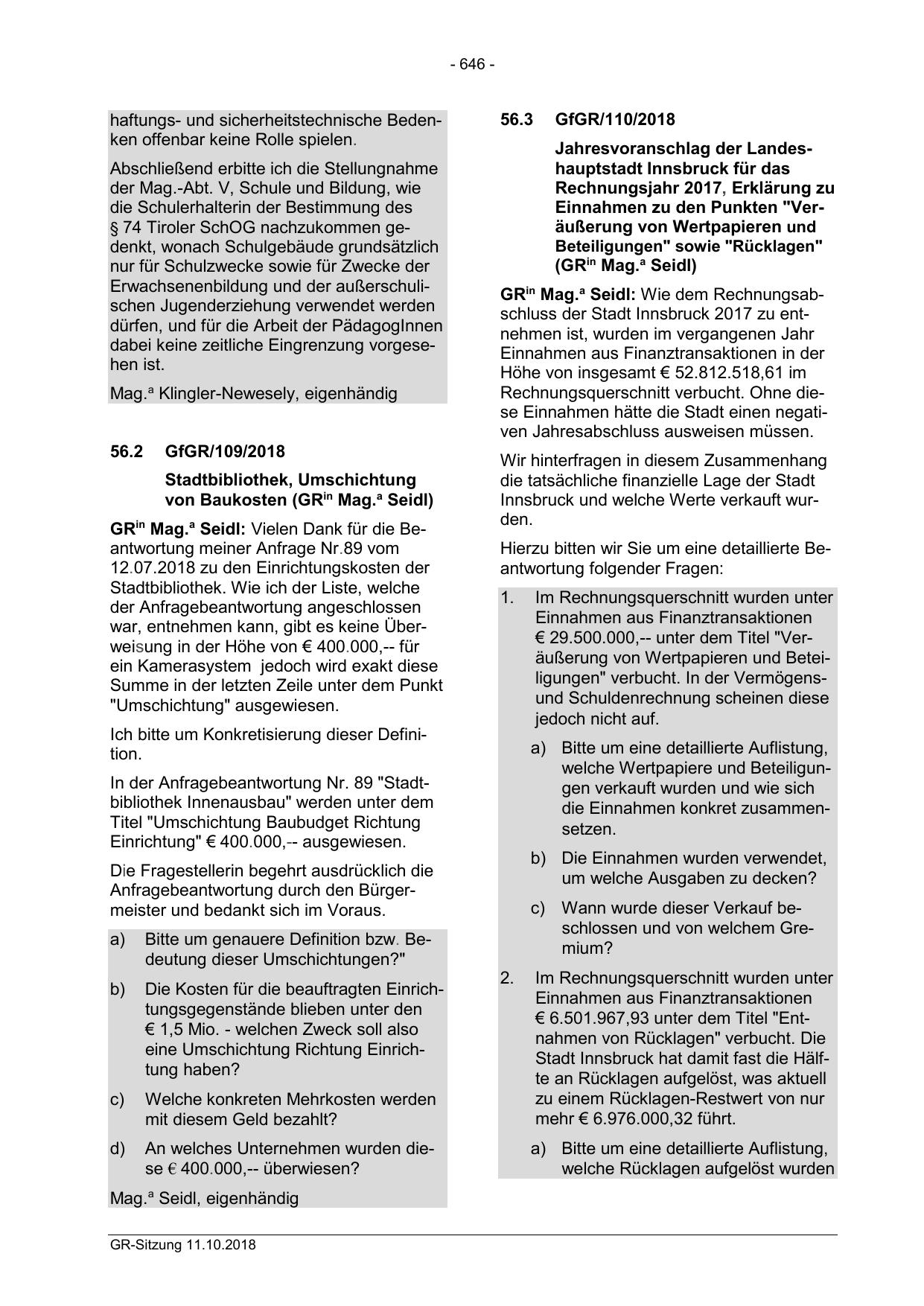 GRin Mag.a Seidl: Wie dem Rechnungsabschluss der Stadt Innsbruck 2017 zu entnehmen ist, wurden im vergangenen Jahr