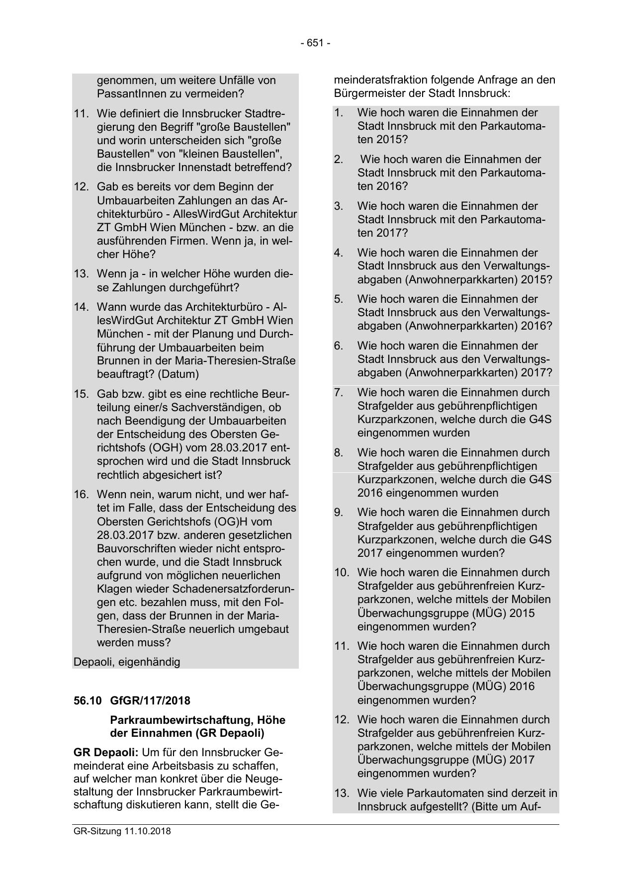 auf welcher man konkret über die Neugestaltung der Innsbrucker Parkraumbewirtschaftung diskutieren kann, stellt die GeGR-Sitzung 11.10.2018