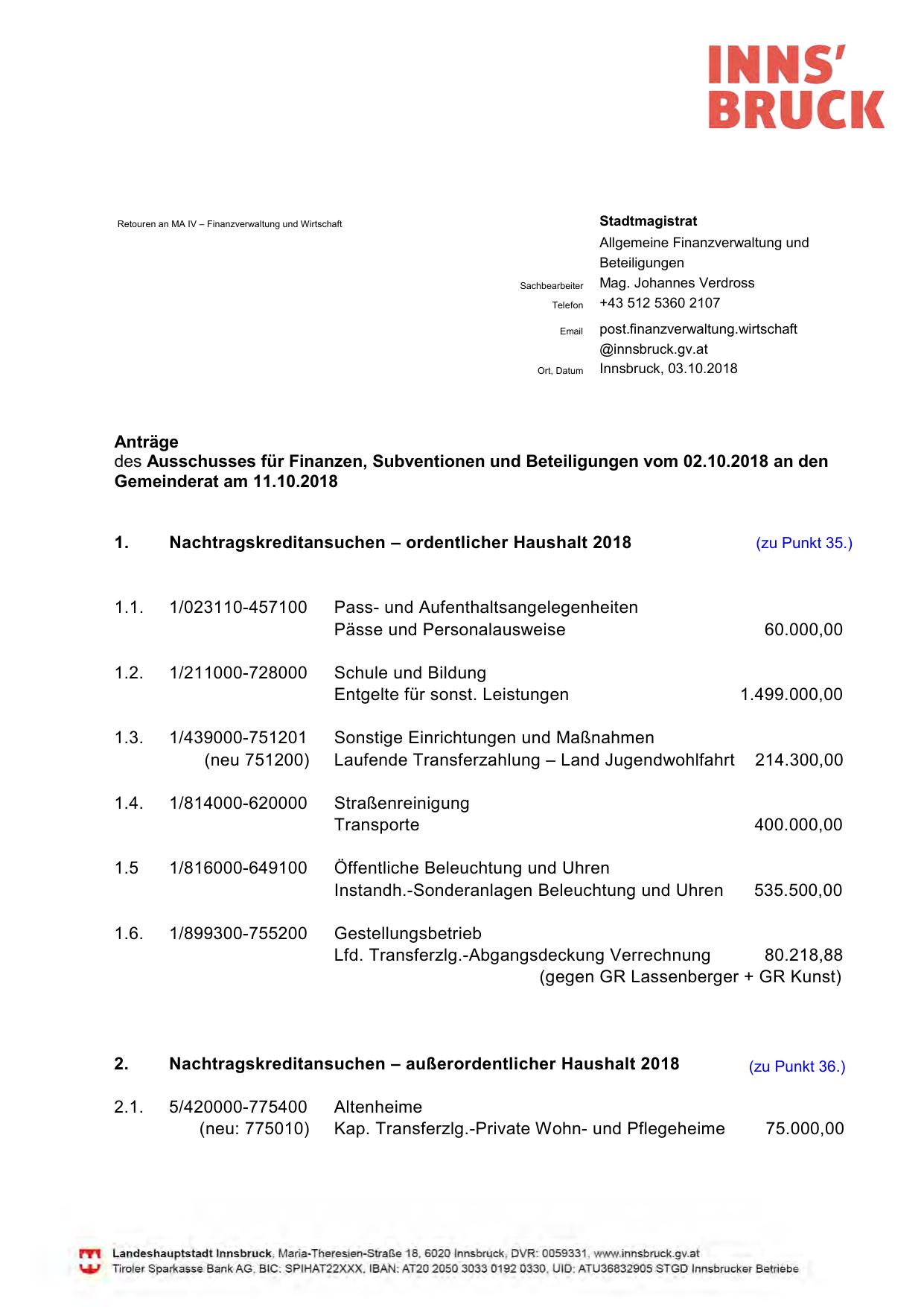 Nachtragskreditansuchen – ordentlicher Haushalt 2018