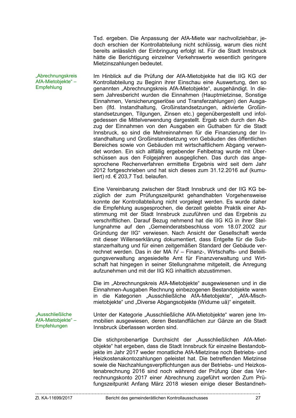 Die stichprobenartige Durchsicht der „Ausschließlichen AfA-Mietobjekte“ hat ergeben, dass die Stadt Innsbruck für einzelne Bestandobjekte im Jahr 2017 weder monatliche AfA-Mietzinse noch Betriebs- und