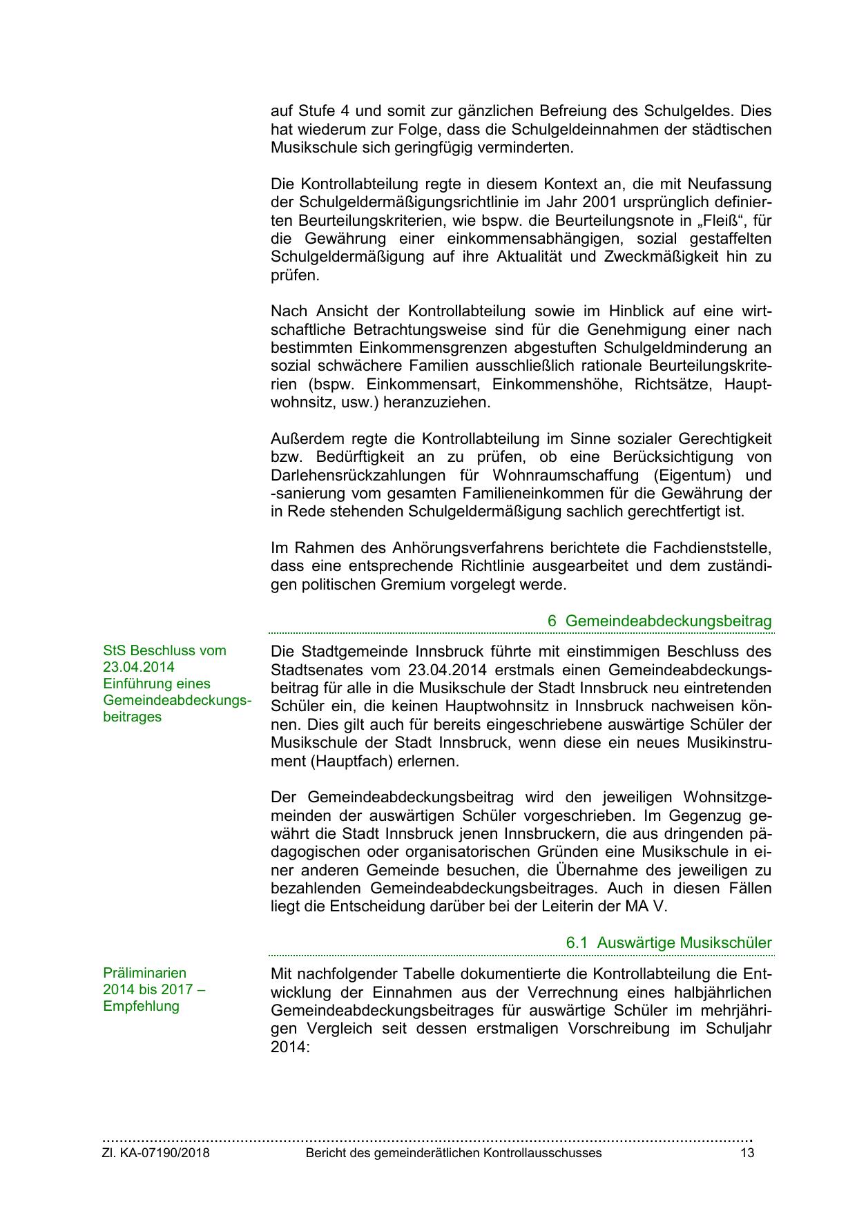 Stadtsenates vom 23.04.2014 erstmals einen Gemeindeabdeckungsbeitrag für alle in die Musikschule der Stadt Innsbruck neu eintretenden