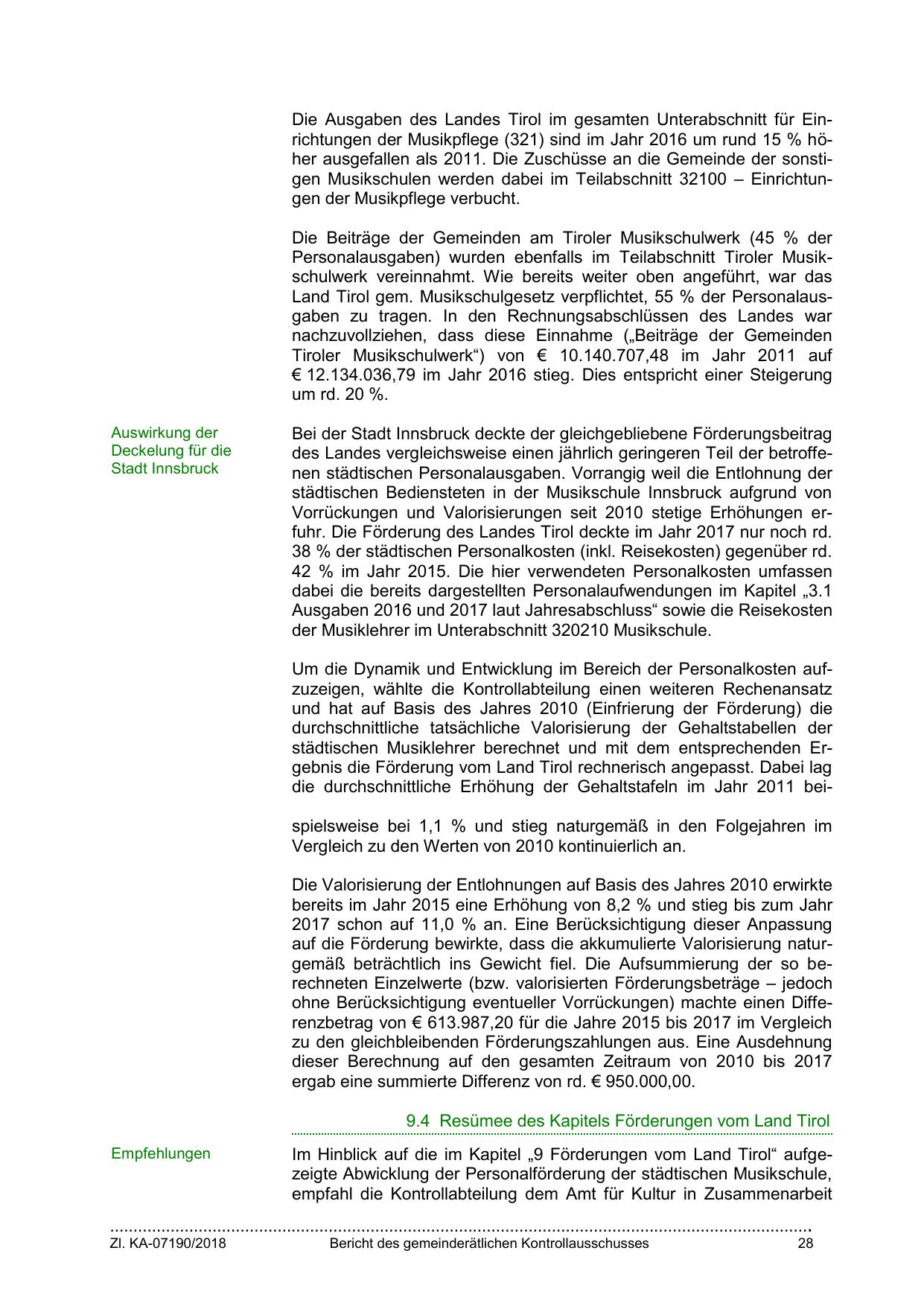 Im Hinblick auf die im Kapitel „9 Förderungen vom Land Tirol“ aufgezeigte Abwicklung der Personalförderung der städtischen Musikschule,