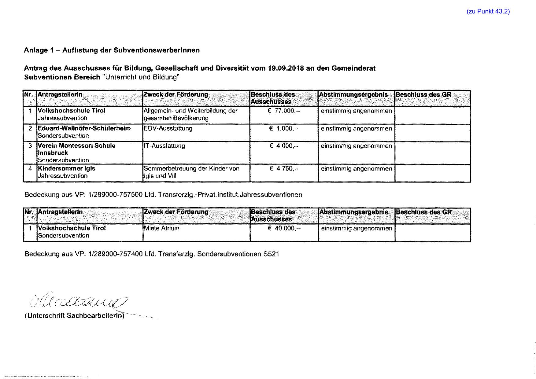 Bedeckung aus VP: 1/289000-757500 Lfd. Transferzlg.-Privat.lnslitut.Jahressubventionen