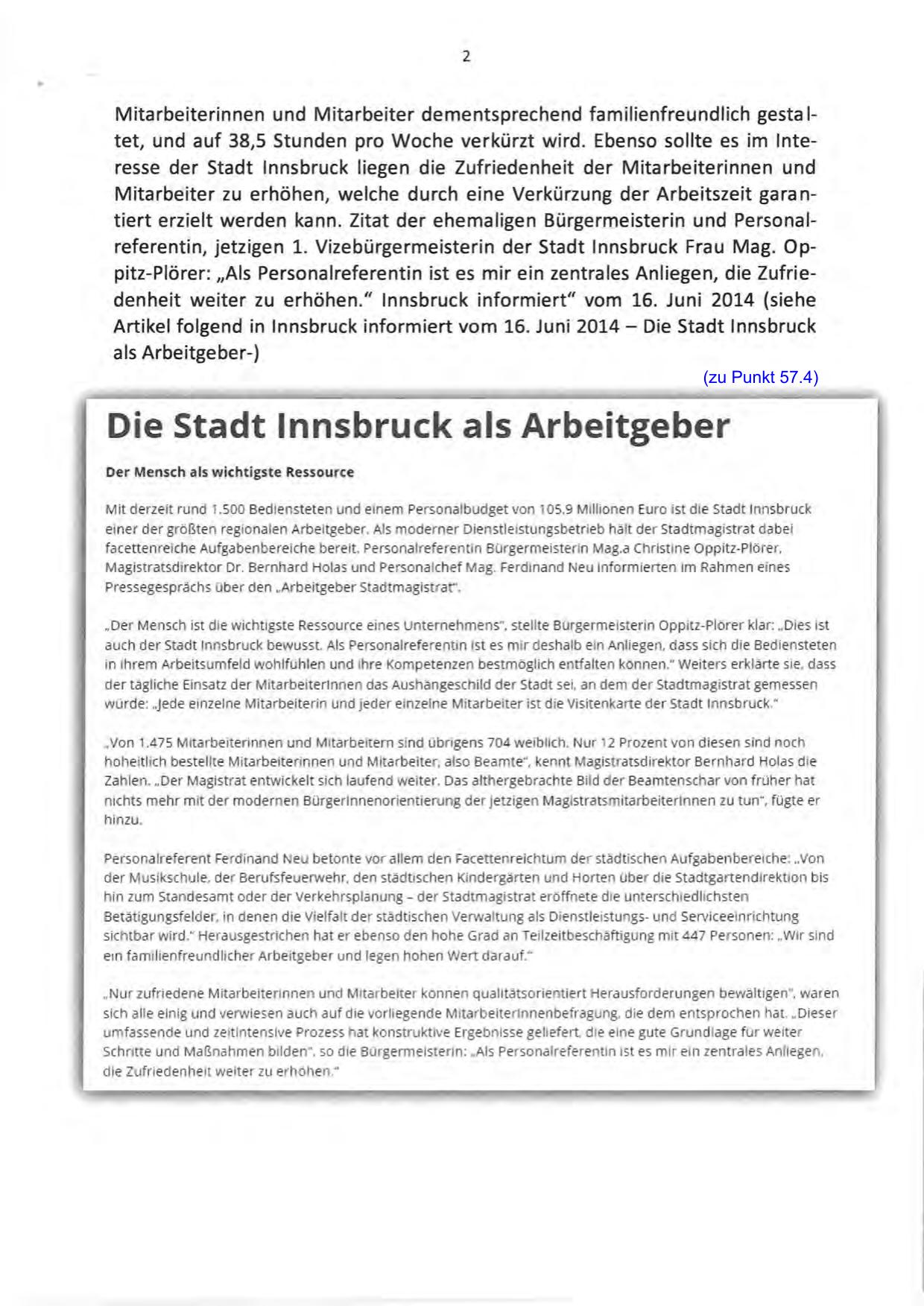 Mitarbeiter zu erhöhen, welche durch eine Verkürzung der Arbeitszeit garantiert erzielt werden kann. Zitat der ehemaligen Bürgermeisterin und Personalreferentin, jetzigen 1. Vizebürgermeisterin der Stadt Innsbruck Frau Mag. Oppitz-Plörer: ,,Als Personalreferentin ist es mir ein zentrales Anliegen, die Zufriedenheit weiter zu erhöhen." Innsbruck informiert" vom 16. Juni 2014 (siehe