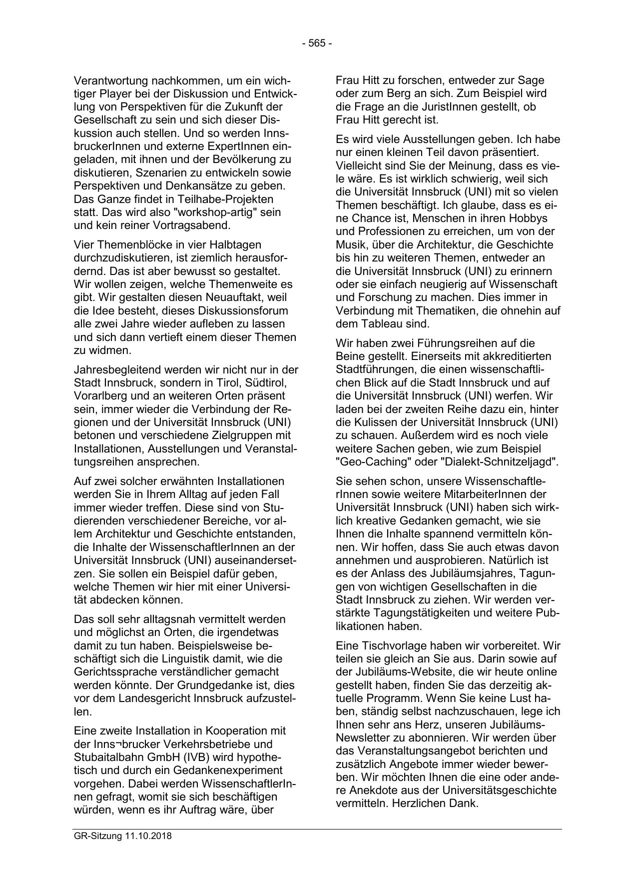 Stadt Innsbruck zu ziehen. Wir werden verstärkte Tagungstätigkeiten und weitere Publikationen haben.