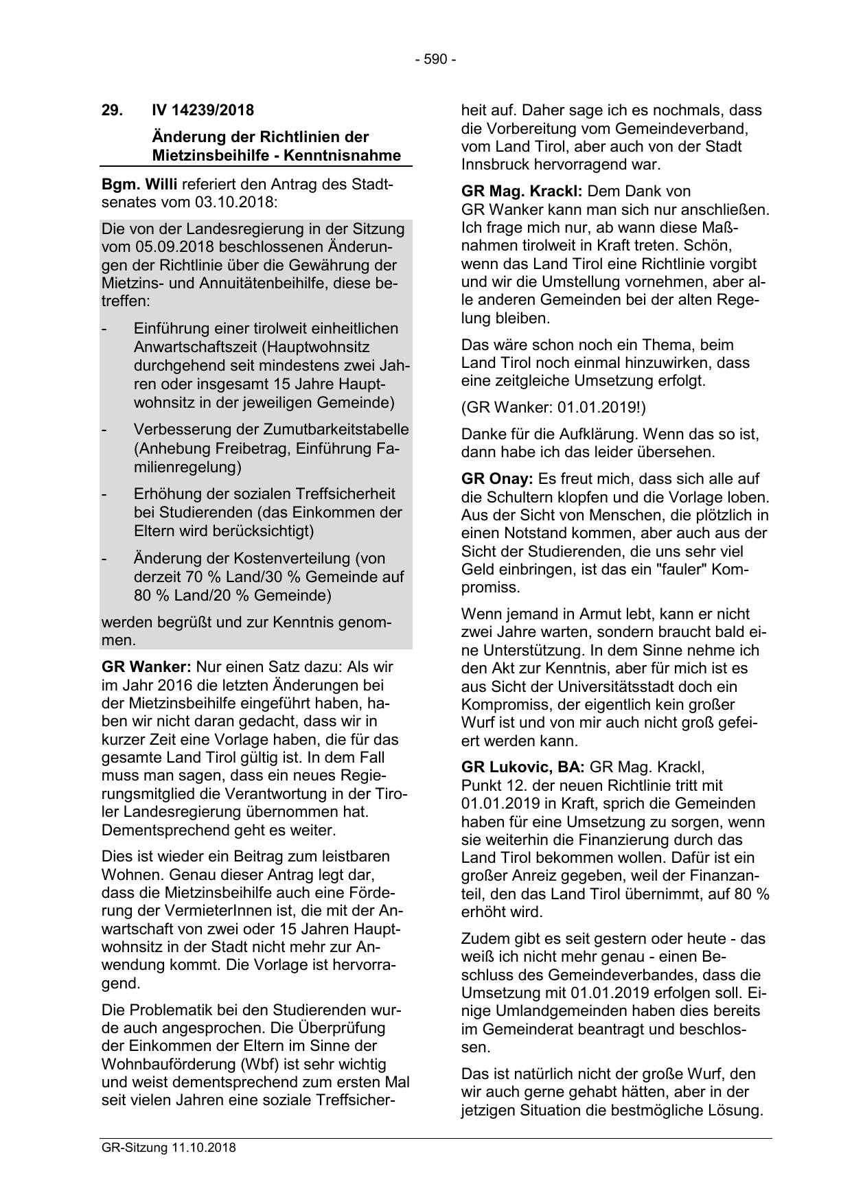 dass die Mietzinsbeihilfe auch eine Förderung der VermieterInnen ist, die mit der Anwartschaft von zwei oder 15 Jahren Hauptwohnsitz in der Stadt nicht mehr zur Anwendung kommt. Die Vorlage ist hervorragend.