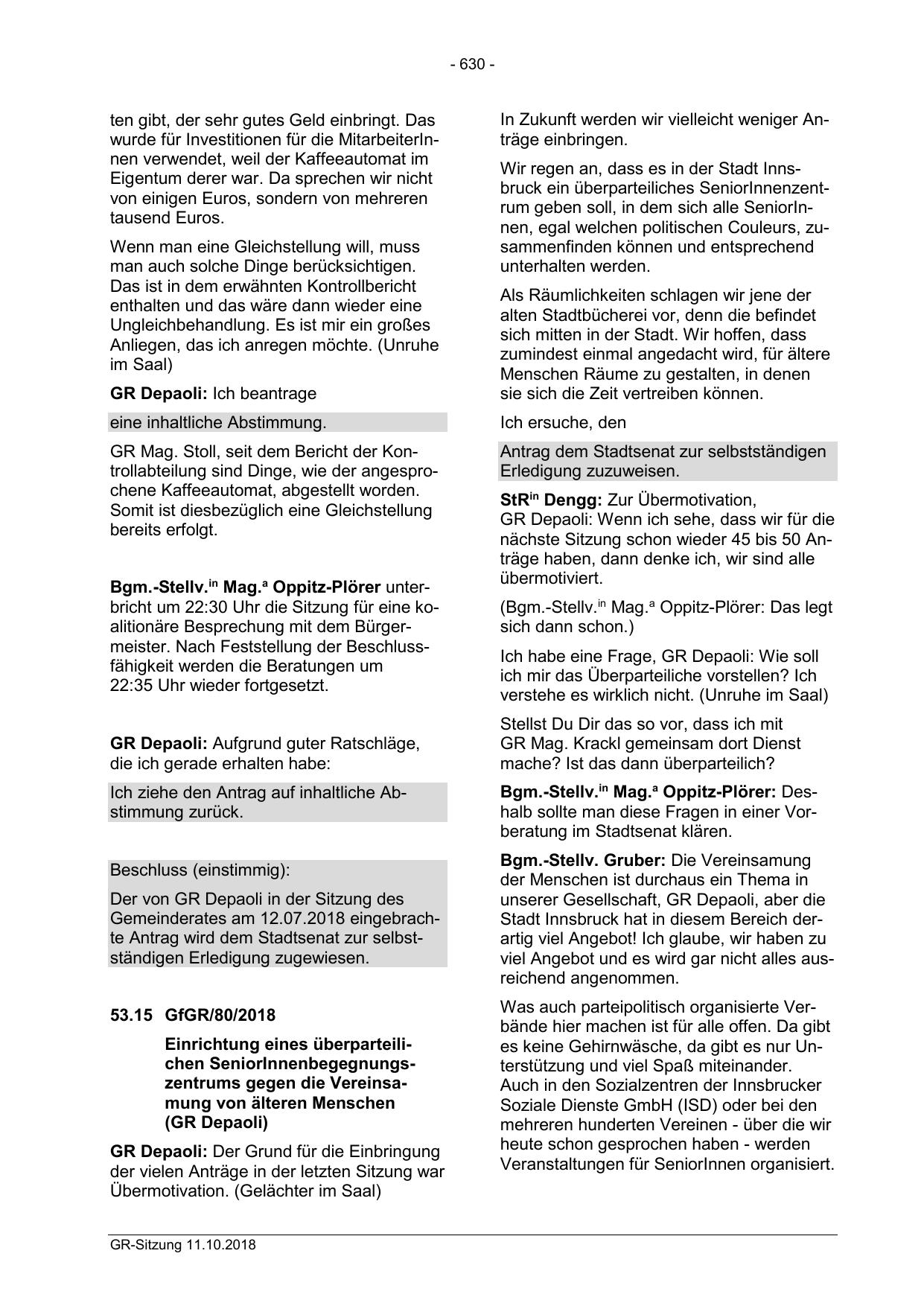 Bgm.-Stellv.in Mag.a Oppitz-Plörer unterbricht um 22:30 Uhr die Sitzung für eine koalitionäre Besprechung mit dem Bürgermeister. Nach Feststellung der Beschlussfähigkeit werden die Beratungen um