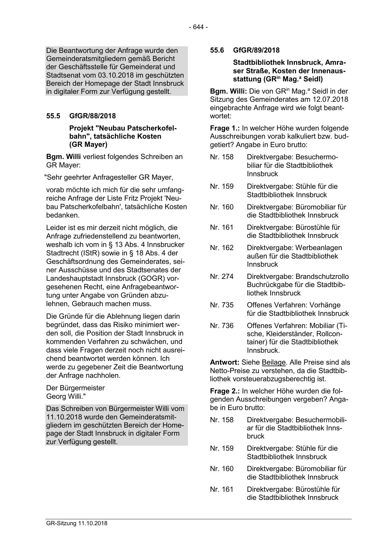 11.10.2018 wurde den Gemeinderatsmitgliedern im geschützten Bereich der Homepage der Stadt Innsbruck in digitaler Form