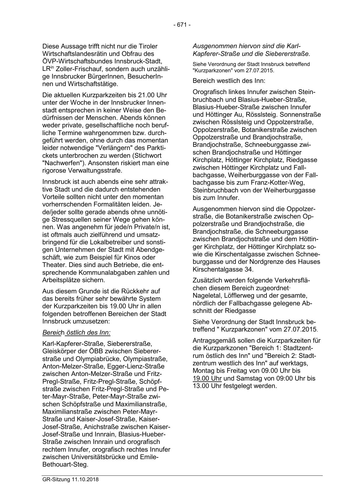 Siehe Verordnung der Stadt Innsbruck betreffend " Kurzparkzonen" vom 27.07.2015.