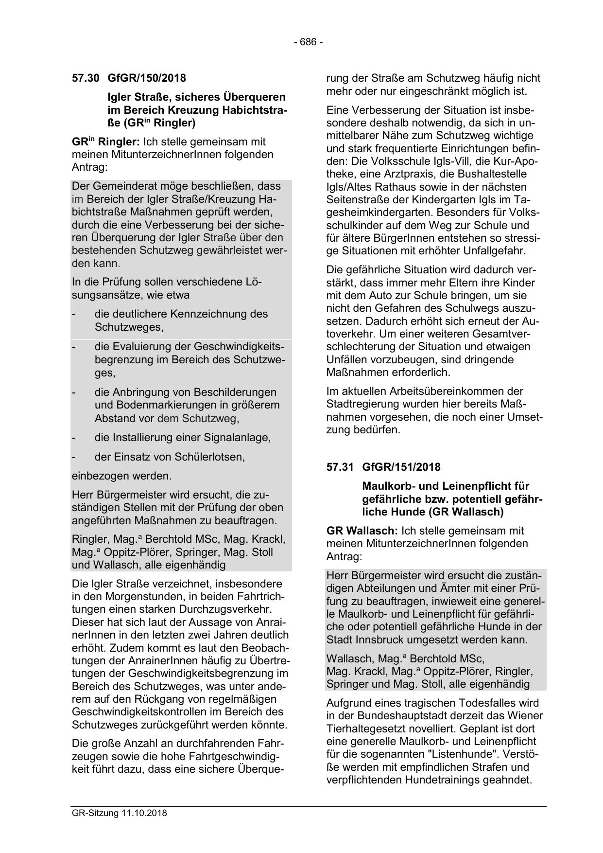 Herr Bürgermeister wird ersucht die zuständigen Abteilungen und Ämter mit einer Prüfung zu beauftragen, inwieweit eine generelle Maulkorb- und Leinenpflicht für gefährliche oder potentiell gefährliche Hunde in der