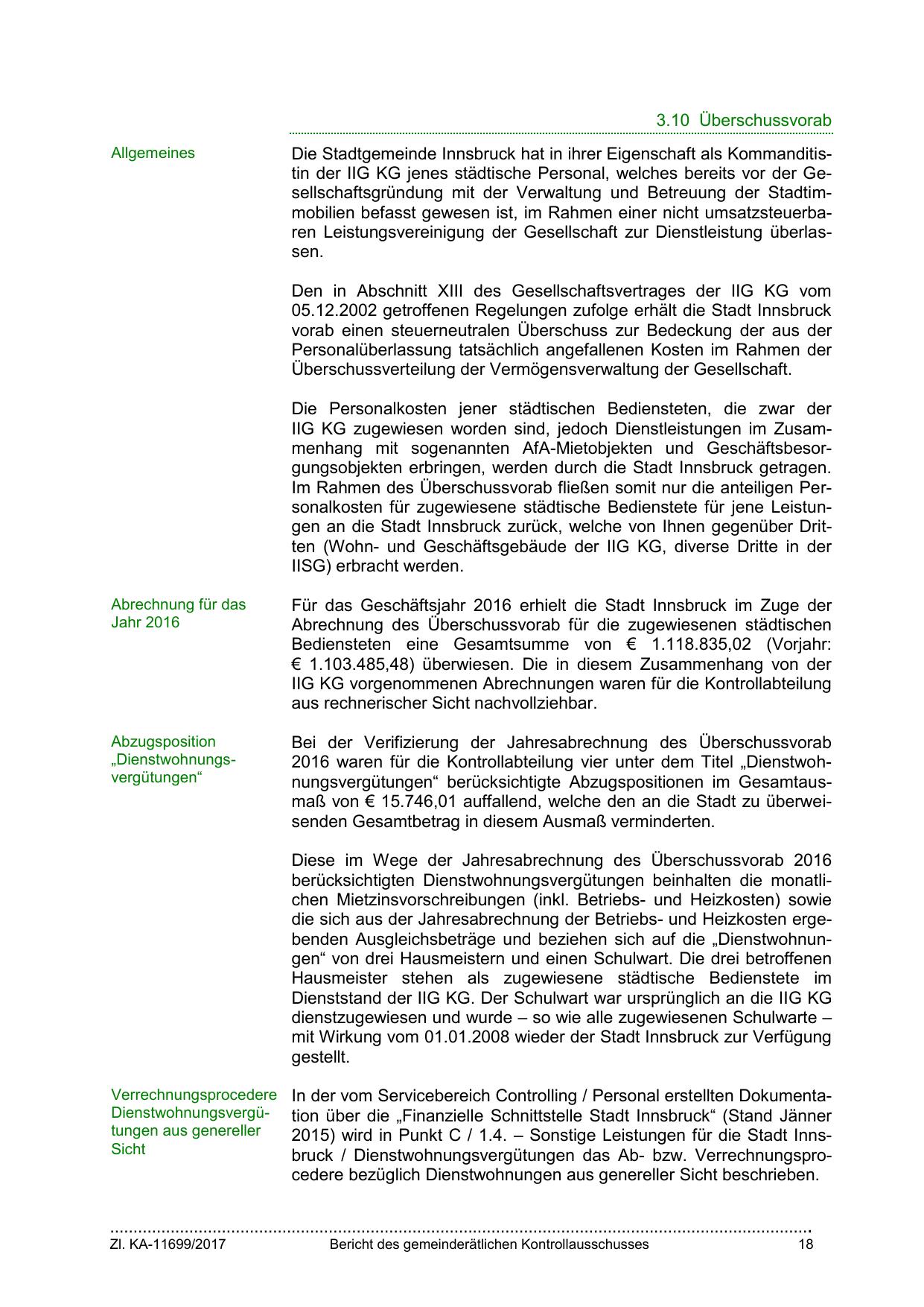 Im Rahmen des Überschussvorab fließen somit nur die anteiligen Personalkosten für zugewiesene städtische Bedienstete für jene Leistungen an die Stadt Innsbruck zurück, welche von Ihnen gegenüber Dritten (Wohn- und Geschäftsgebäude der IIG KG, diverse Dritte in der