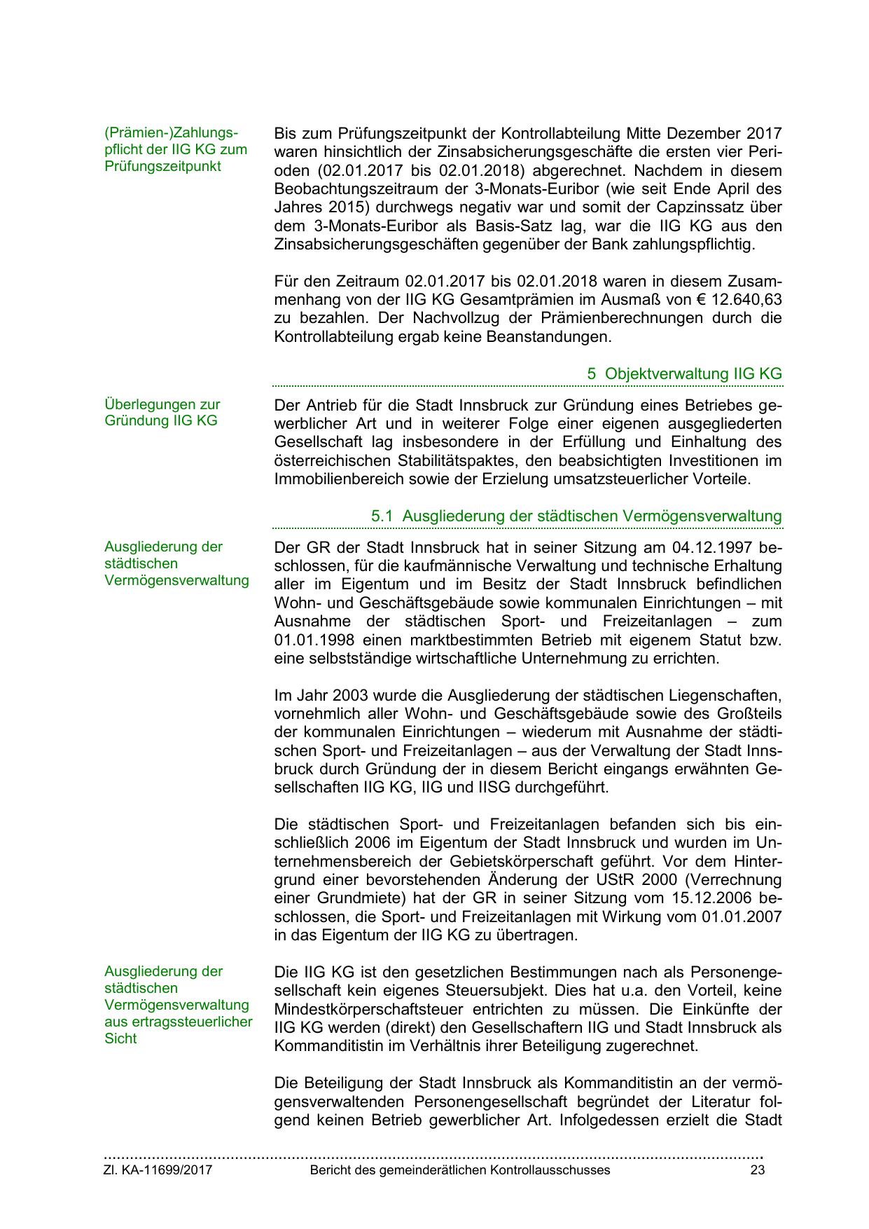 der kommunalen Einrichtungen – wiederum mit Ausnahme der städtischen Sport- und Freizeitanlagen – aus der Verwaltung der Stadt Innsbruck durch Gründung der in diesem Bericht eingangs erwähnten Gesellschaften IIG KG, IIG und IISG durchgeführt.