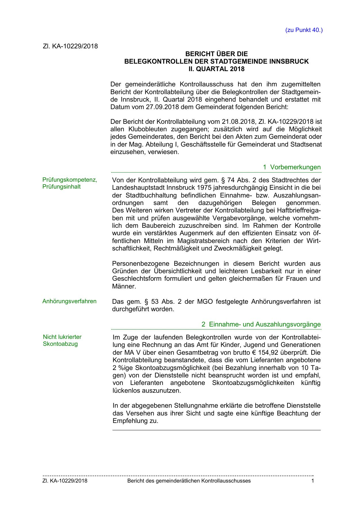 Bericht der Kontrollabteilung über die Belegkontrollen der Stadtgemeinde Innsbruck, II. Quartal 2018 eingehend behandelt und erstattet mit