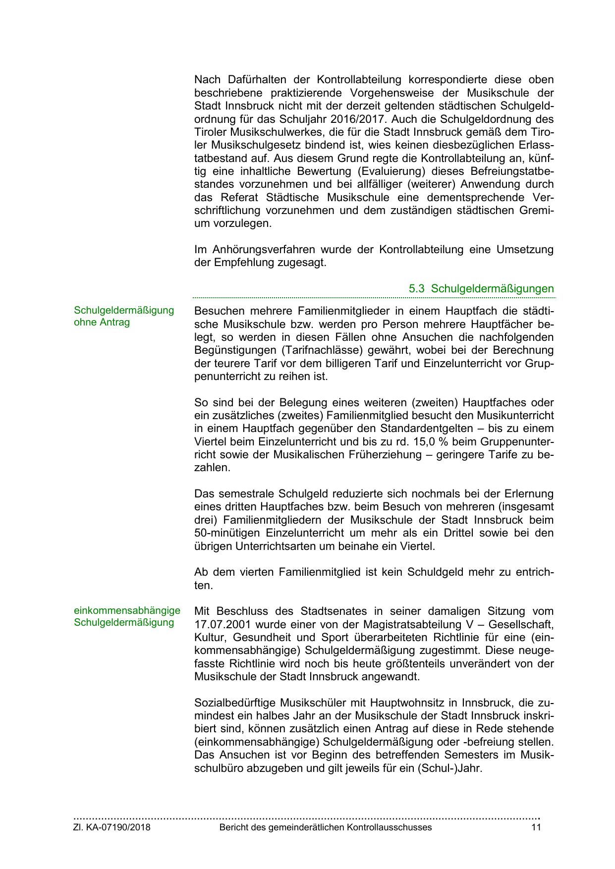 Tiroler Musikschulwerkes, die für die Stadt Innsbruck gemäß dem Tiroler Musikschulgesetz bindend ist, wies keinen diesbezüglichen Erlasstatbestand auf. Aus diesem Grund regte die Kontrollabteilung an, künftig eine inhaltliche Bewertung (Evaluierung) dieses Befreiungstatbestandes vorzunehmen und bei allfälliger (weiterer) Anwendung durch