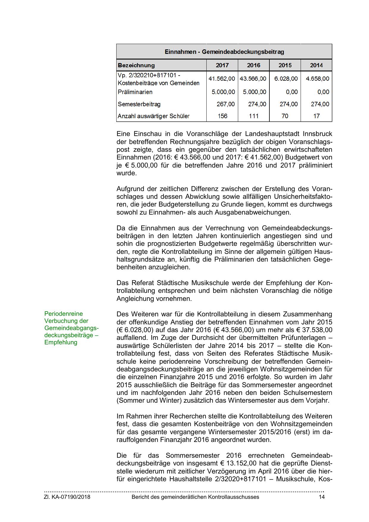 auswärtige Schülerlisten der Jahre 2014 bis 2017 – stellte die Kontrollabteilung fest, dass von Seiten des Referates Städtische Musikschule keine periodenreine Vorschreibung der betreffenden Gemeindeabgangsdeckungsbeiträge an die jeweiligen Wohnsitzgemeinden für