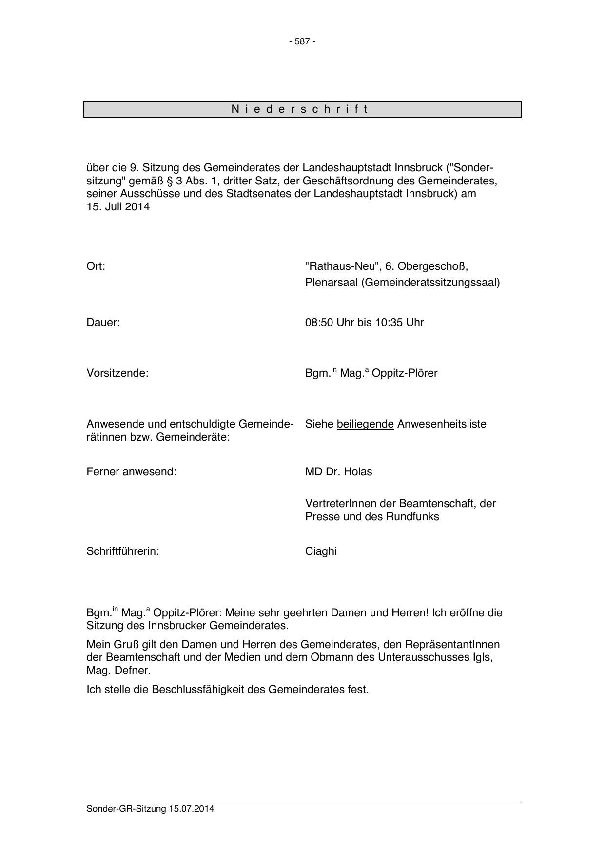 über die 9. Sitzung des Gemeinderates der Landeshauptstadt Innsbruck ("Sondersitzung" gemäß § 3 Abs. 1, dritter Satz, der Geschäftsordnung des Gemeinderates,