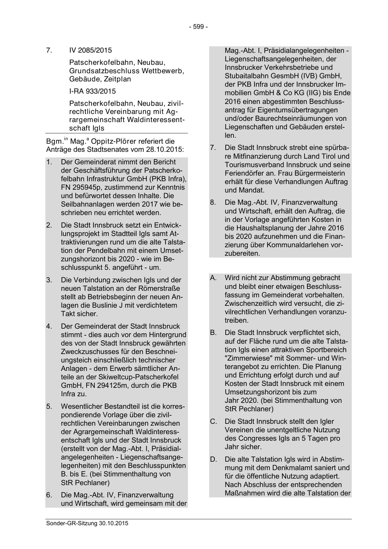 Die Stadt Innsbruck setzt ein Entwicklungsprojekt im Stadtteil Igls samt Attraktivierungen rund um die alte Talstation der Pendelbahn mit einem Umsetzungshorizont bis 2020 - wie im Beschlusspunkt 5. angeführt - um.