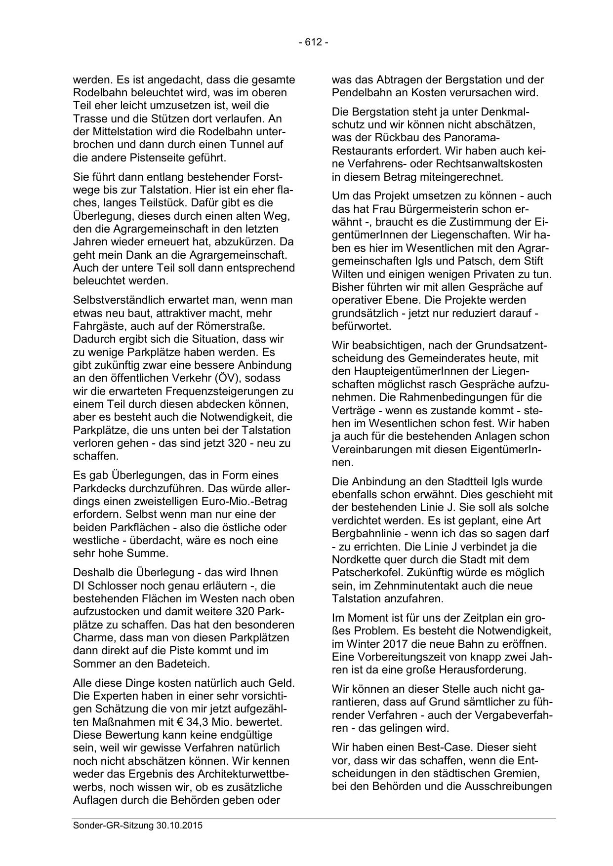 das hat Frau Bürgermeisterin schon erwähnt -, braucht es die Zustimmung der EigentümerInnen der Liegenschaften. Wir haben es hier im Wesentlichen mit den Agrargemeinschaften Igls und Patsch, dem Stift
