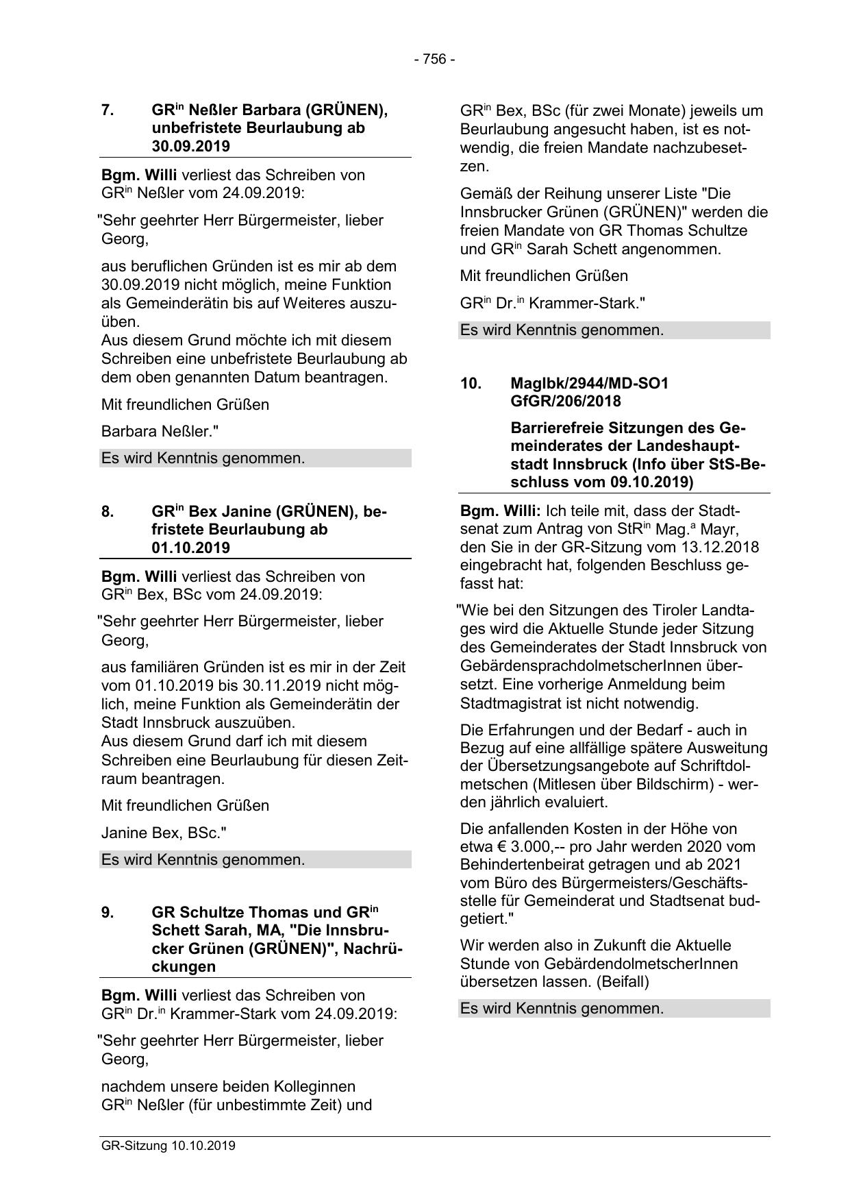 Barrierefreie Sitzungen des Gemeinderates der Landeshauptstadt Innsbruck (Info über StS-Beschluss vom 09.10.2019)