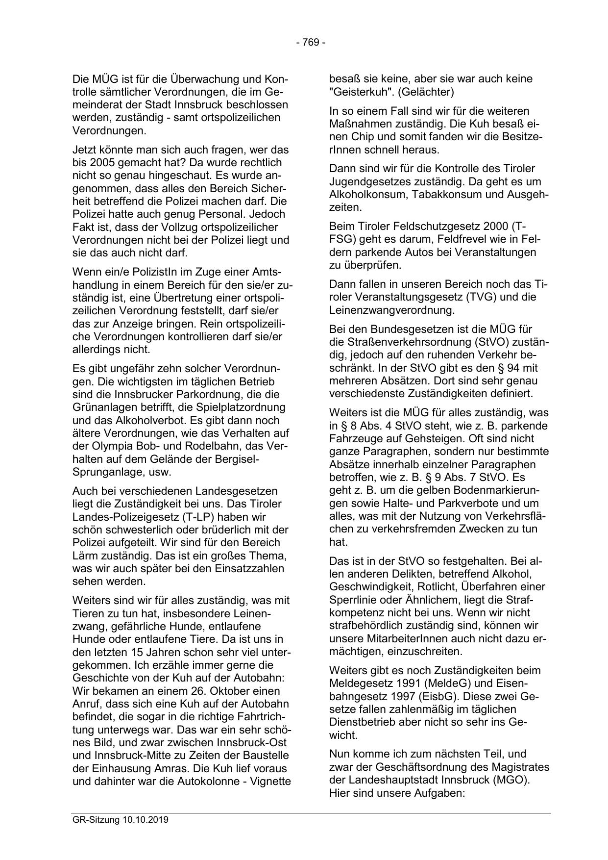 Die MÜG ist für die Überwachung und Kontrolle sämtlicher Verordnungen, die im Gemeinderat der Stadt Innsbruck beschlossen