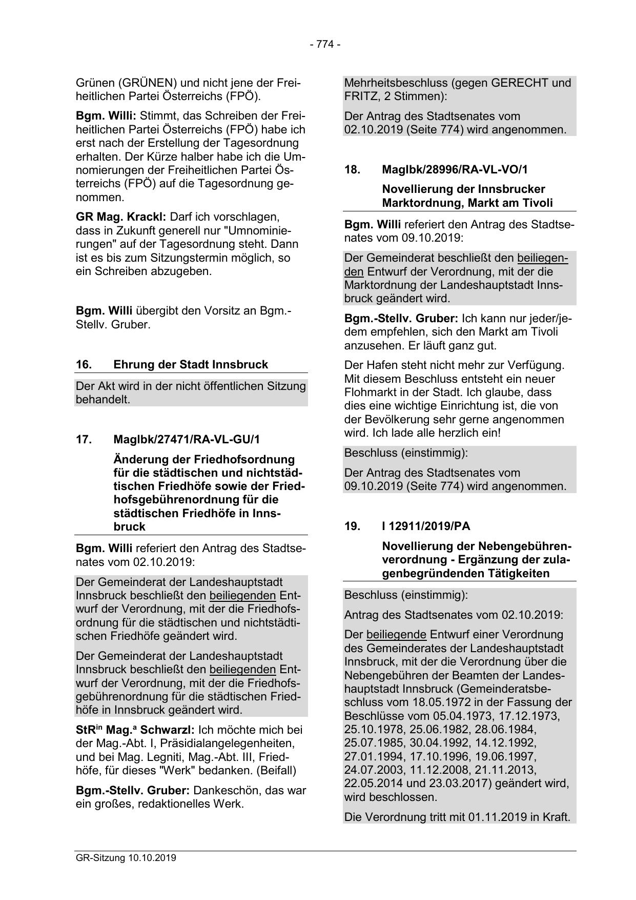Innsbruck beschließt den beiliegenden Entwurf der Verordnung, mit der die Friedhofsgebührenordnung für die städtischen Friedhöfe in Innsbruck geändert wird.