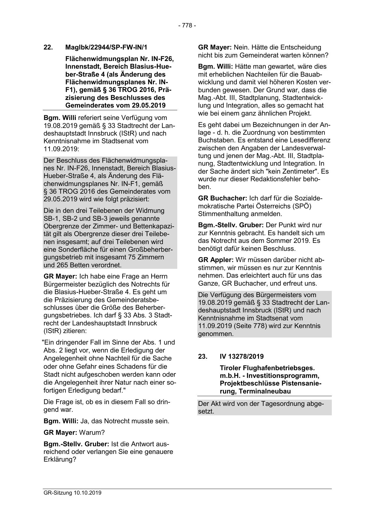 die Präzisierung des Gemeinderatsbeschlusses über die Größe des Beherbergungsbetriebes. Ich darf § 33 Abs. 3 Stadtrecht der Landeshauptstadt Innsbruck