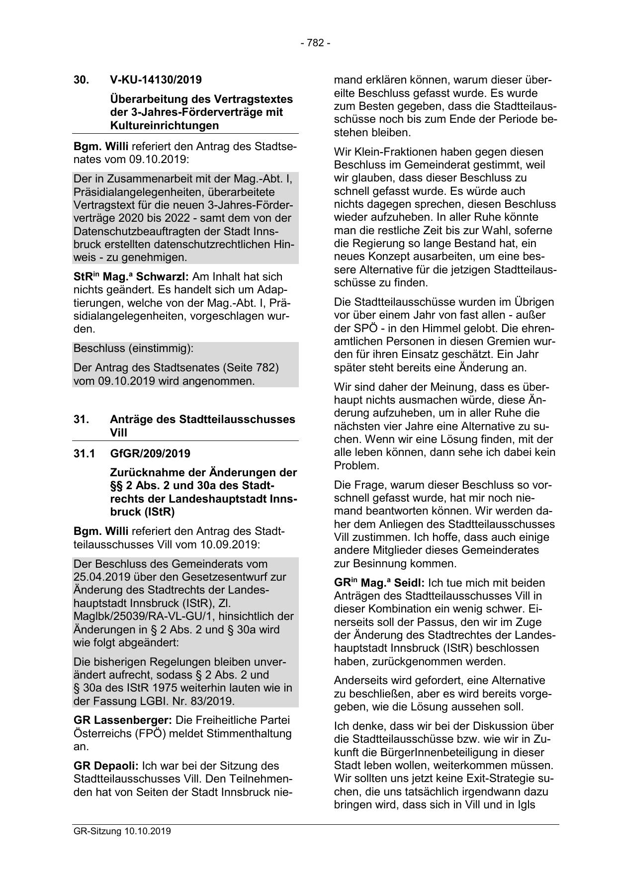 Stadtteilausschusses Vill. Den Teilnehmenden hat von Seiten der Stadt Innsbruck nieGR-Sitzung 10.10.2019