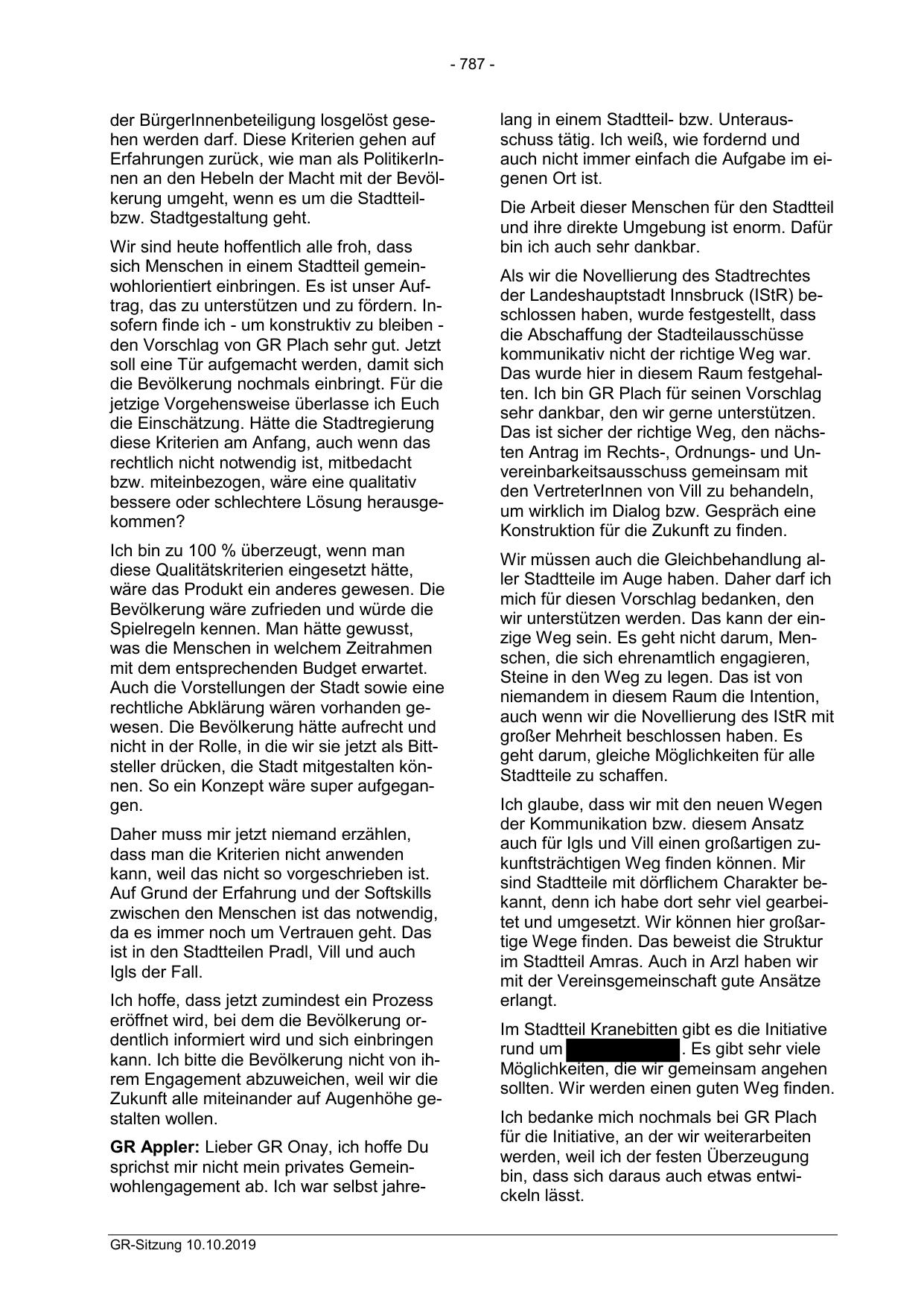 sich Menschen in einem Stadtteil gemeinwohlorientiert einbringen. Es ist unser Auftrag, das zu unterstützen und zu fördern. Insofern finde ich - um konstruktiv zu bleiben den Vorschlag von GR Plach sehr gut. Jetzt