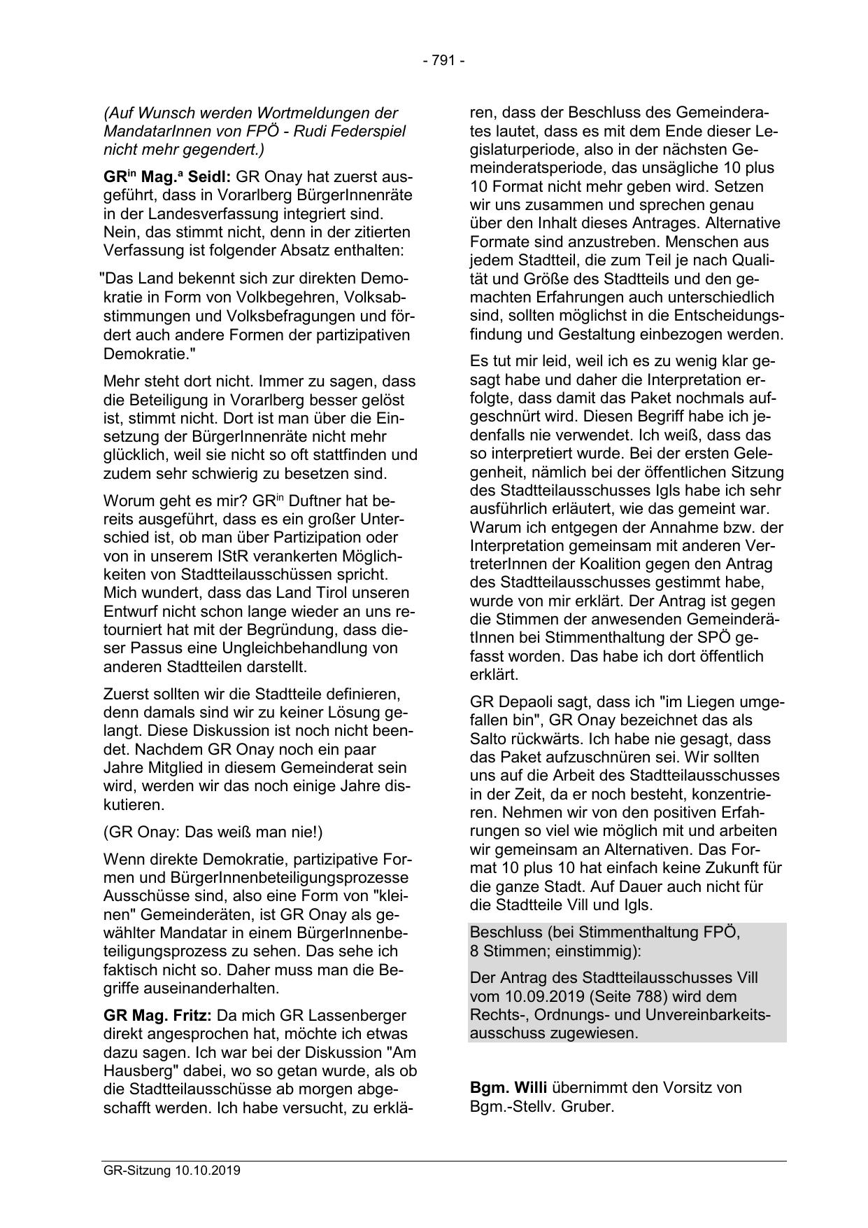 GRin Mag.a Seidl: GR Onay hat zuerst ausgeführt, dass in Vorarlberg BürgerInnenräte