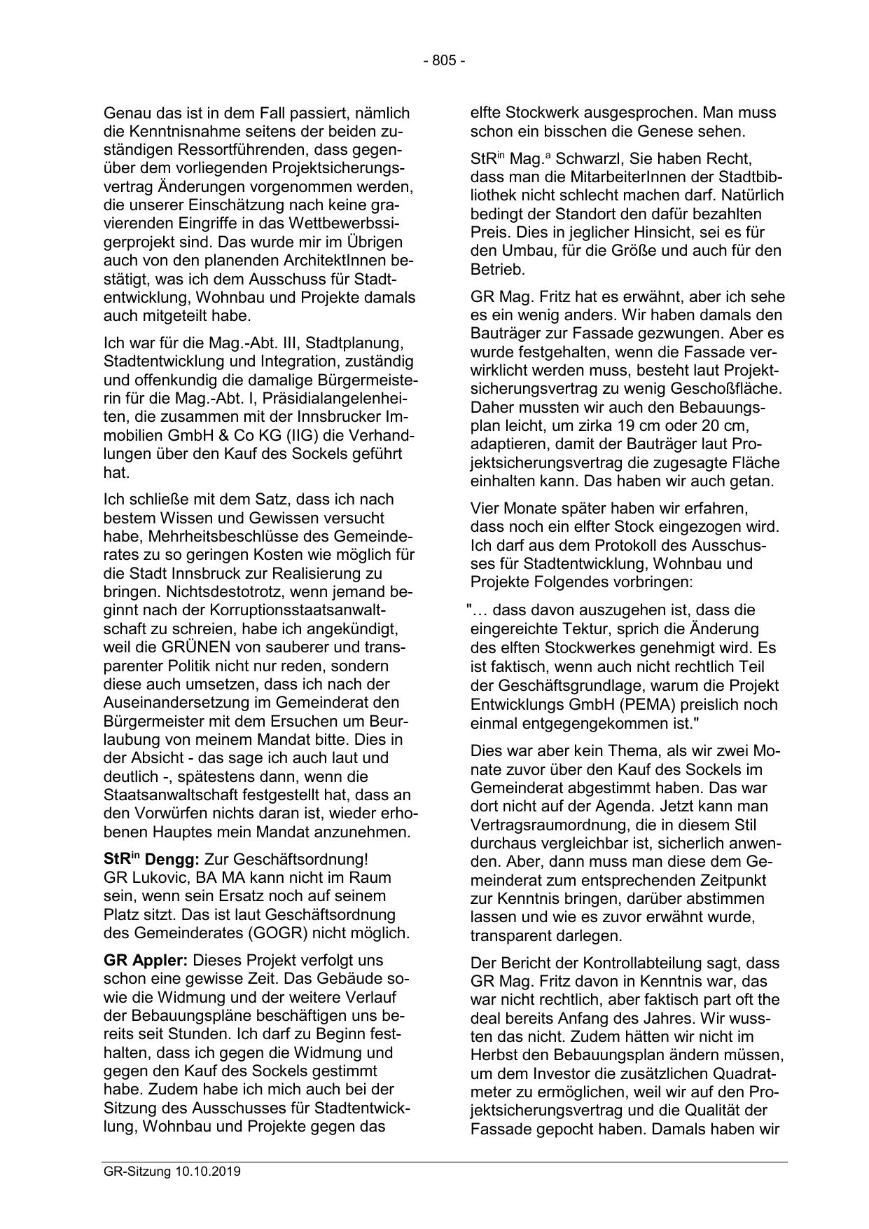 und offenkundig die damalige Bürgermeisterin für die Mag.-Abt. I, Präsidialangelenheiten, die zusammen mit der Innsbrucker Immobilien GmbH & Co KG (IIG) die Verhandlungen über den Kauf des Sockels geführt