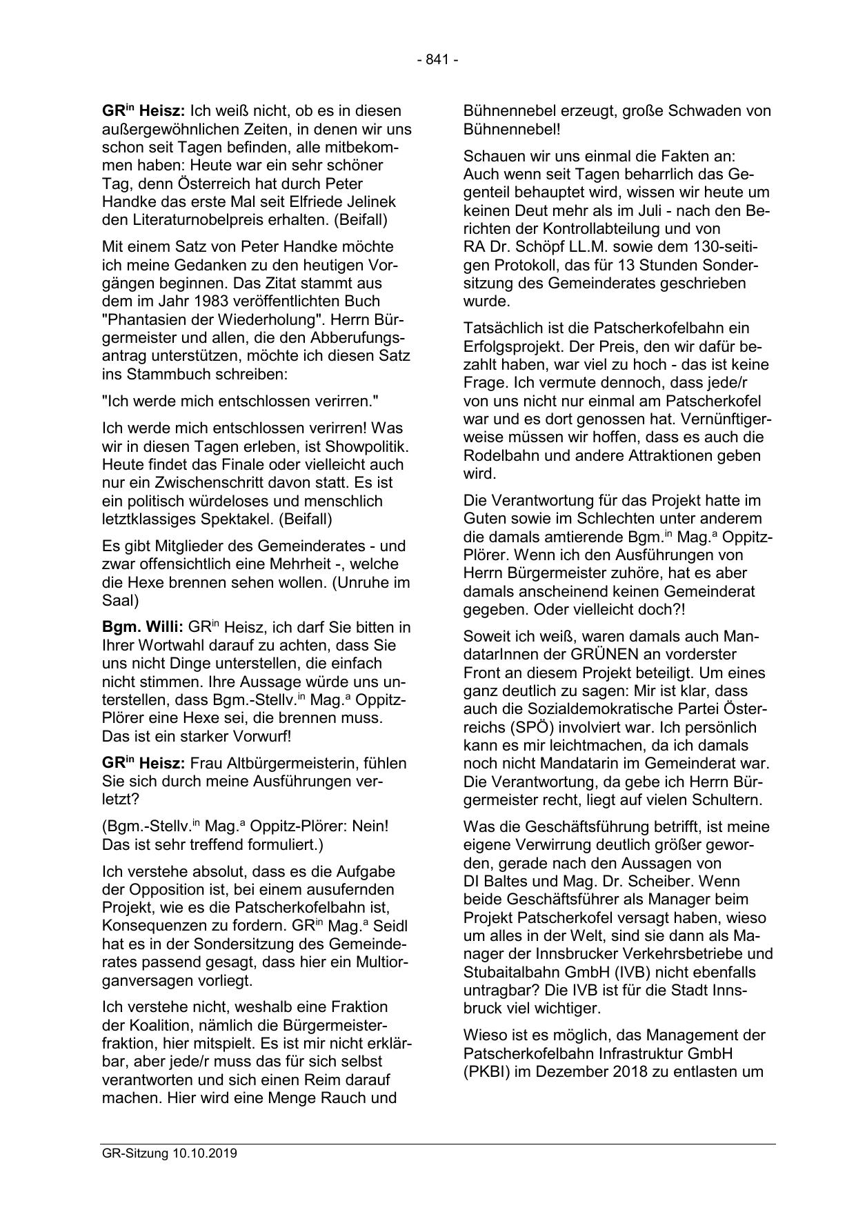 RA Dr. Schöpf LL.M. sowie dem 130-seitigen Protokoll, das für 13 Stunden Sondersitzung des Gemeinderates geschrieben