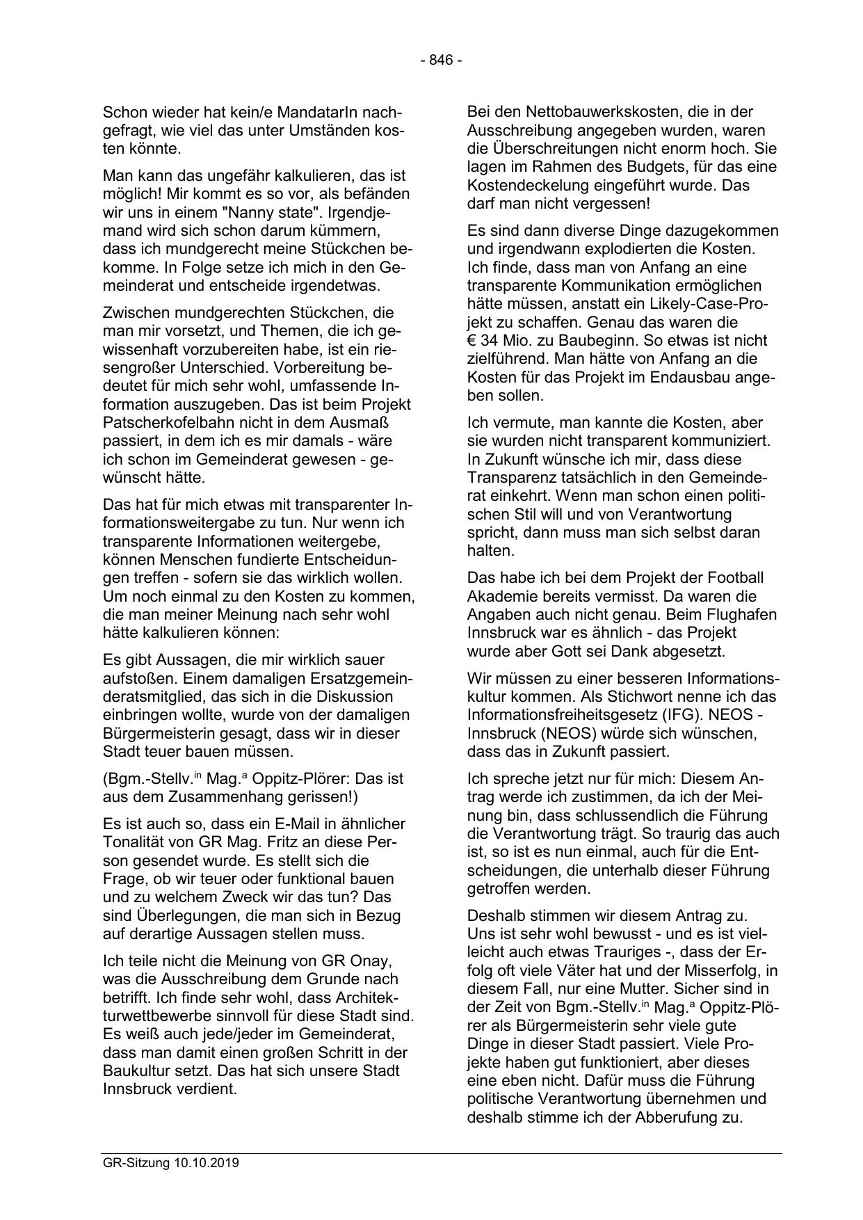 Transparenz tatsächlich in den Gemeinderat einkehrt. Wenn man schon einen politischen Stil will und von Verantwortung