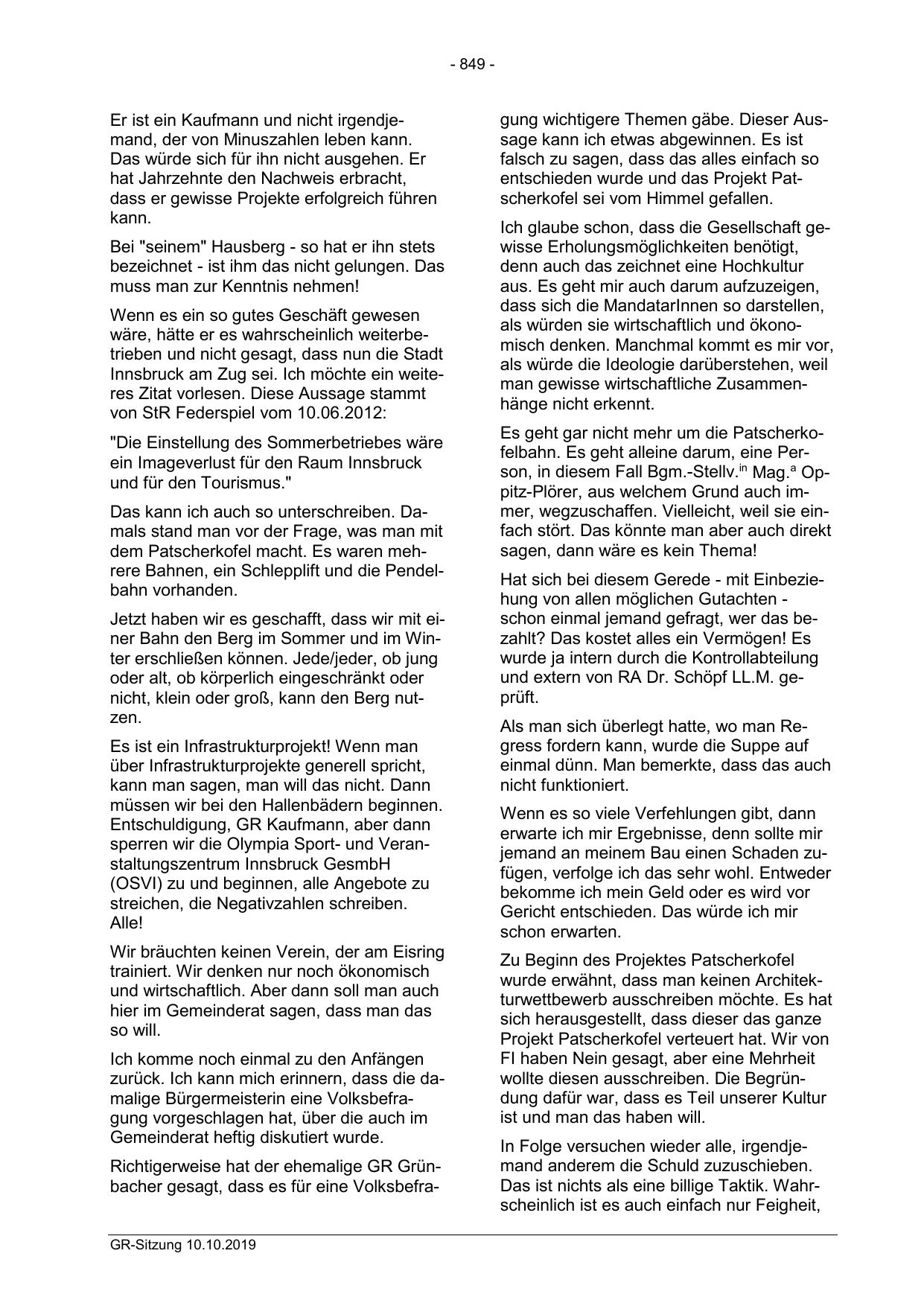 Es geht gar nicht mehr um die Patscherkofelbahn. Es geht alleine darum, eine Person, in diesem Fall Bgm.-Stellv.in Mag.a Oppitz-Plörer, aus welchem Grund auch immer, wegzuschaffen. Vielleicht, weil sie einfach stört. Das könnte man aber auch direkt