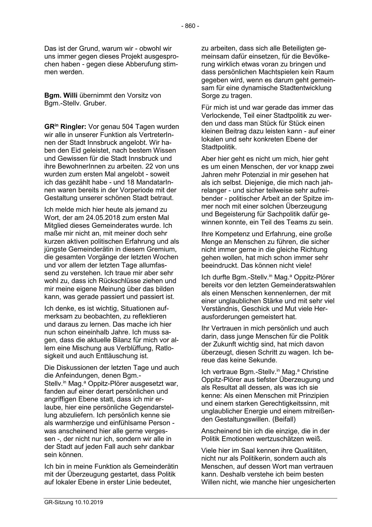 wir alle in unserer Funktion als VertreterInnen der Stadt Innsbruck angelobt. Wir haben den Eid geleistet, nach bestem Wissen