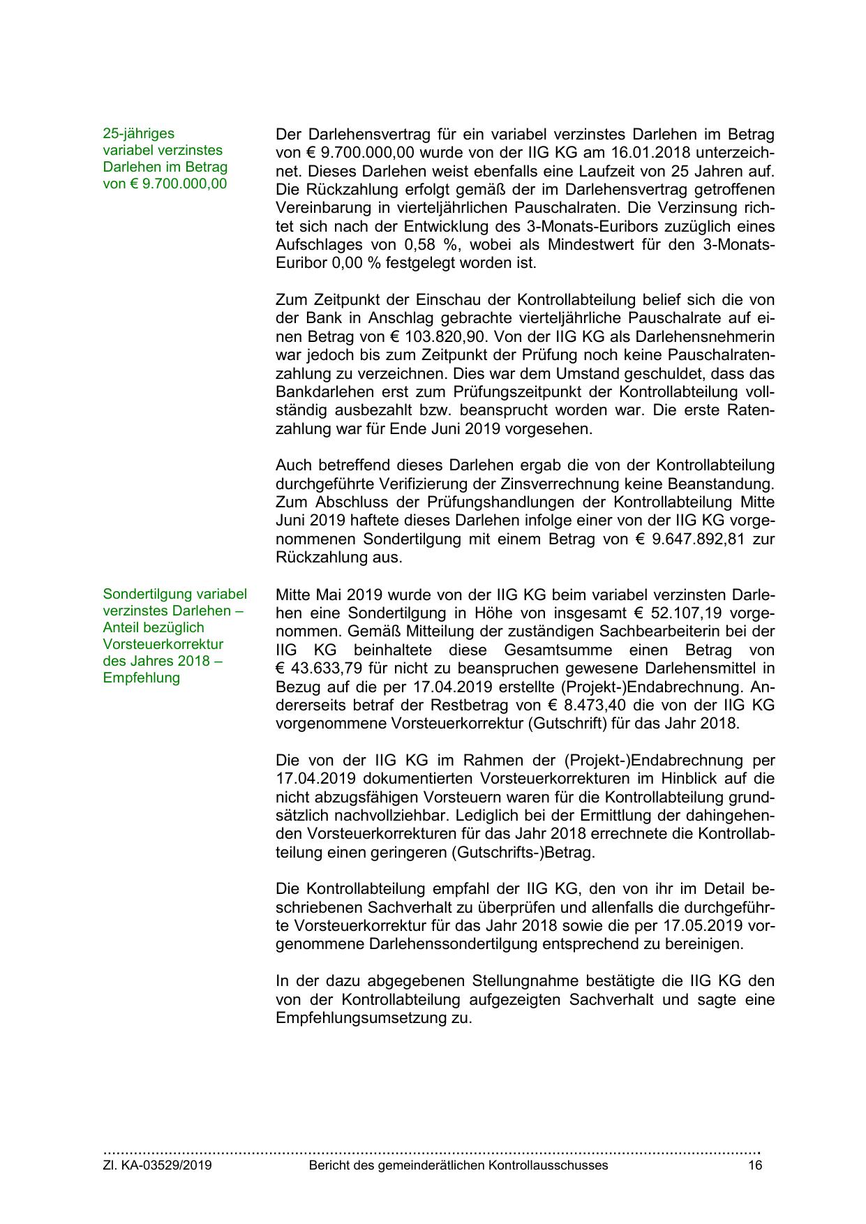Mitte Mai 2019 wurde von der IIG KG beim variabel verzinsten Darlehen eine Sondertilgung in Höhe von insgesamt € 52.107,19 vorgenommen. Gemäß Mitteilung der zuständigen Sachbearbeiterin bei der