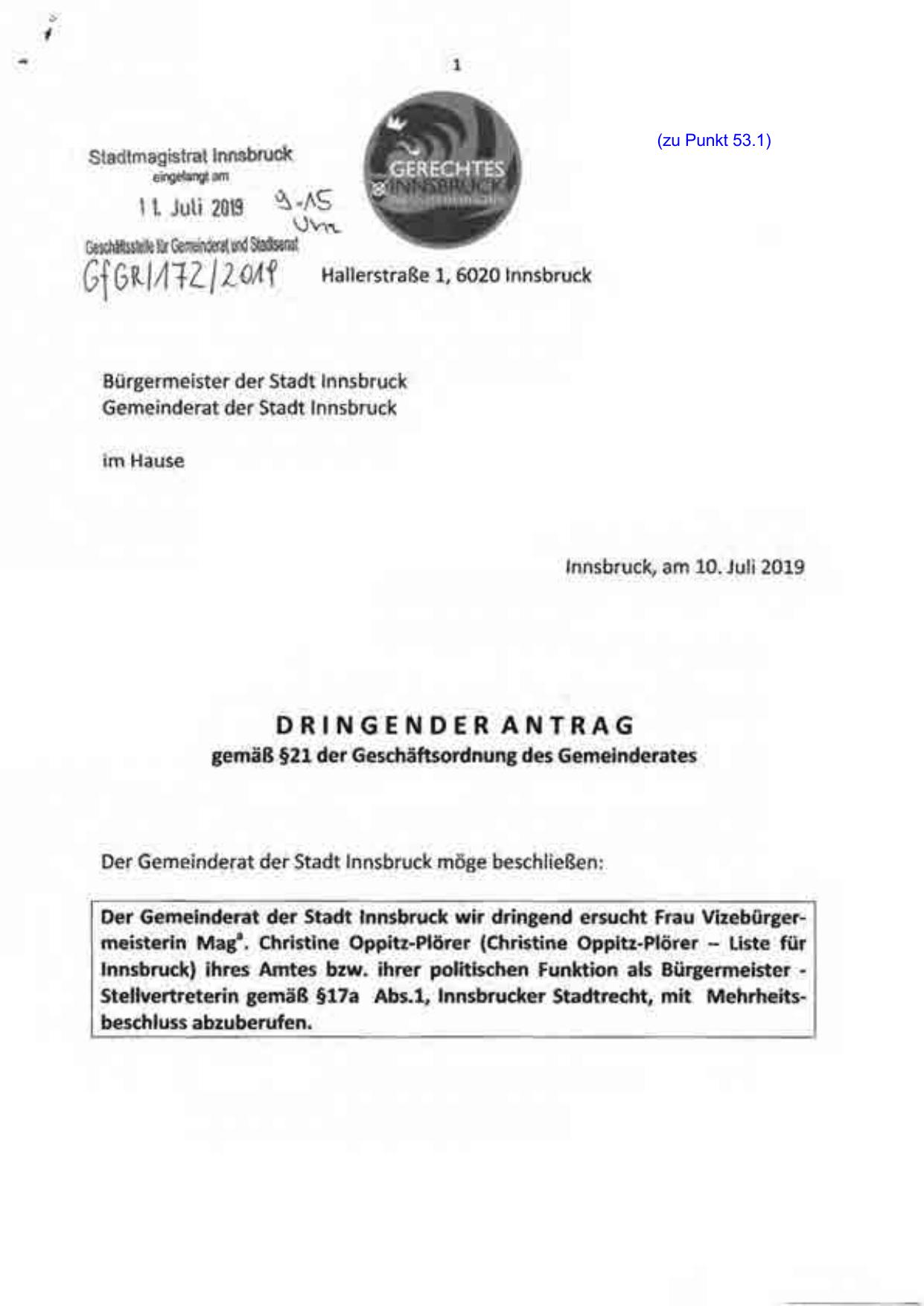 Der Gemeinderat der Stadt Innsbruck wir dringend ersucht Frau Vizebürgermeisterin Maga. Christine Oppitz-Plörer (Christine Oppitz-Plörer - Liste für