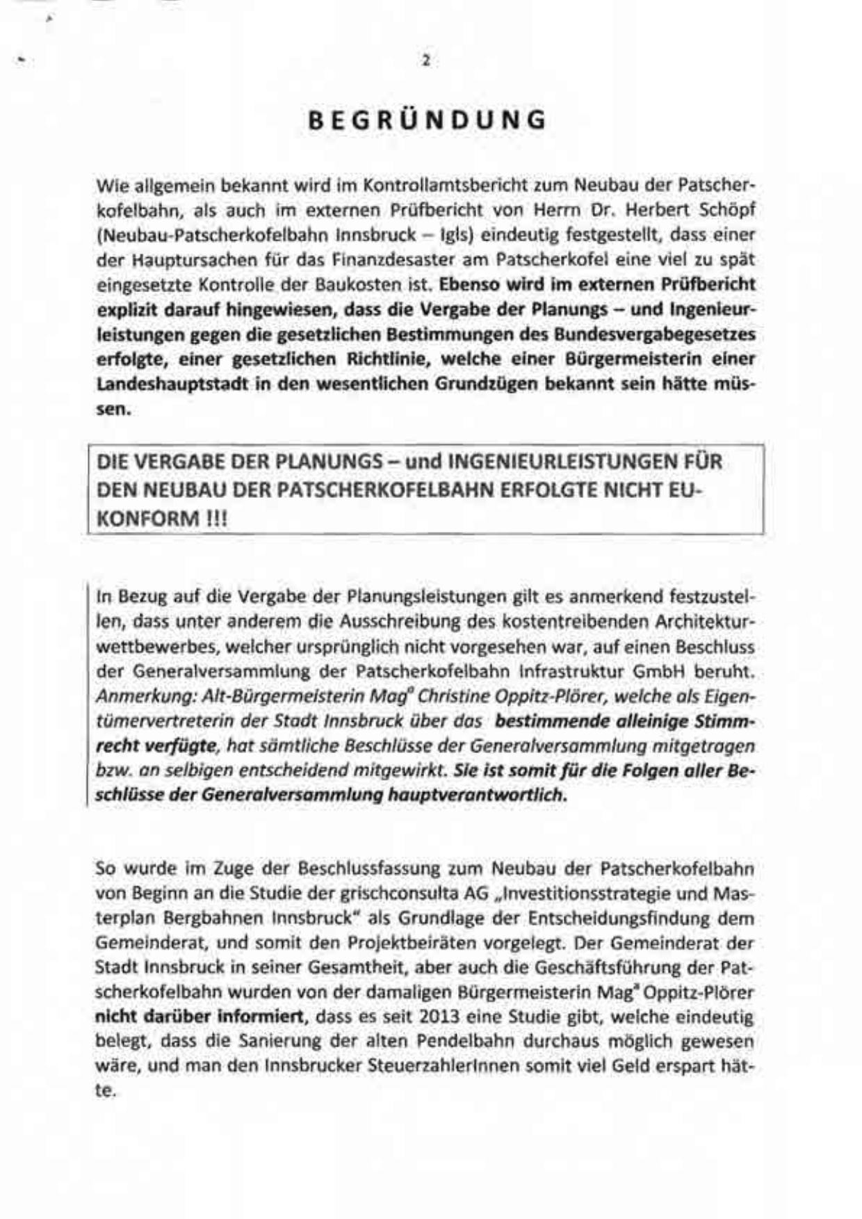 Wie allgemein bekannt wird im Kontrollamtsbericht zum Neubau der Patscherkofelbahn, als auch im externen Prüfbericht von Herrn Dr. Herbert Schöpf